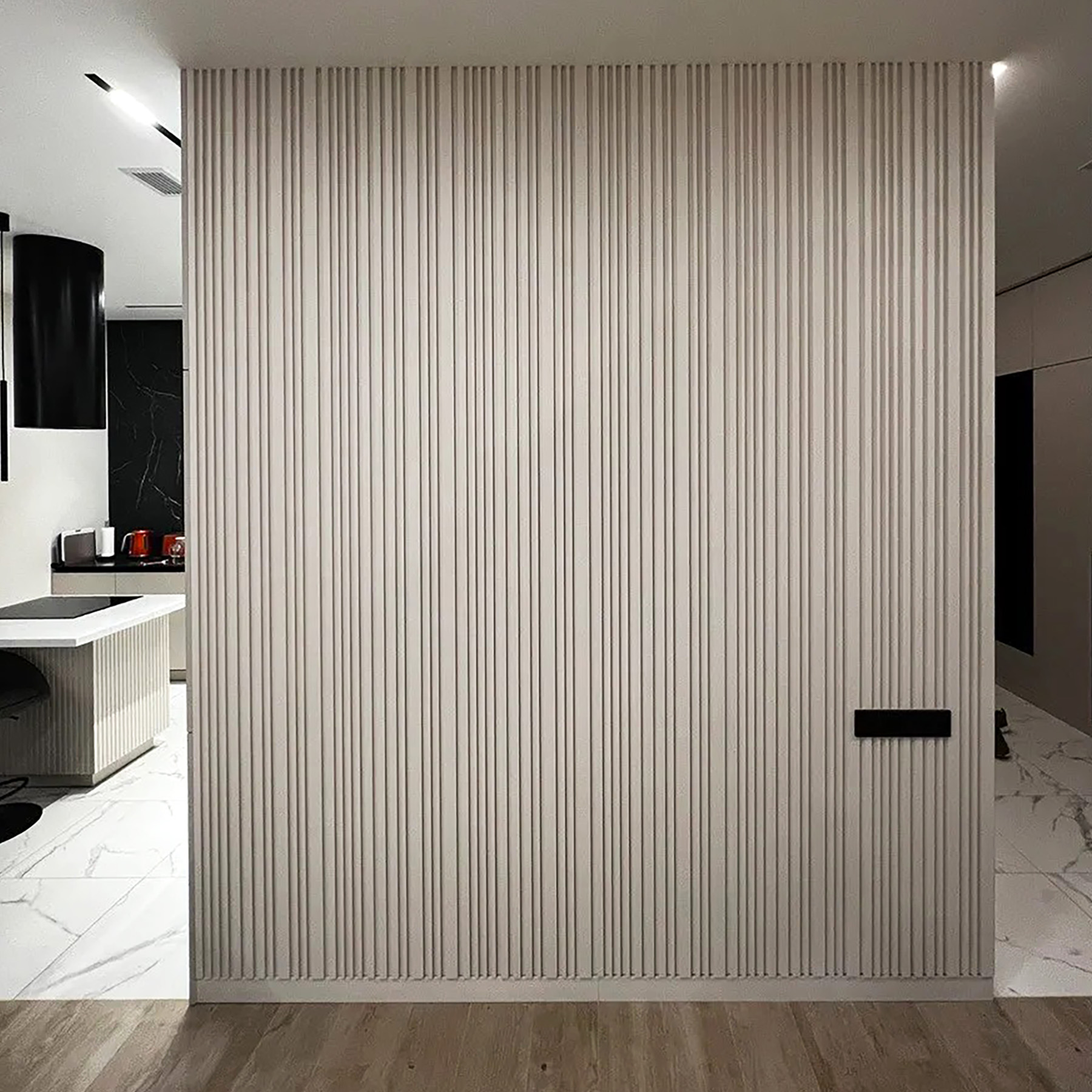 Гіпсові панелі Barcode - це новий декор у вигляді рейок, які різняться товщиною та мають оригінальне чергування. Стильний лінійний дизайн додає стрункого ефекту в сучасних інтер’єрах. Чергування товстіших та тонших рейок створює цікавий ритм на стіні.