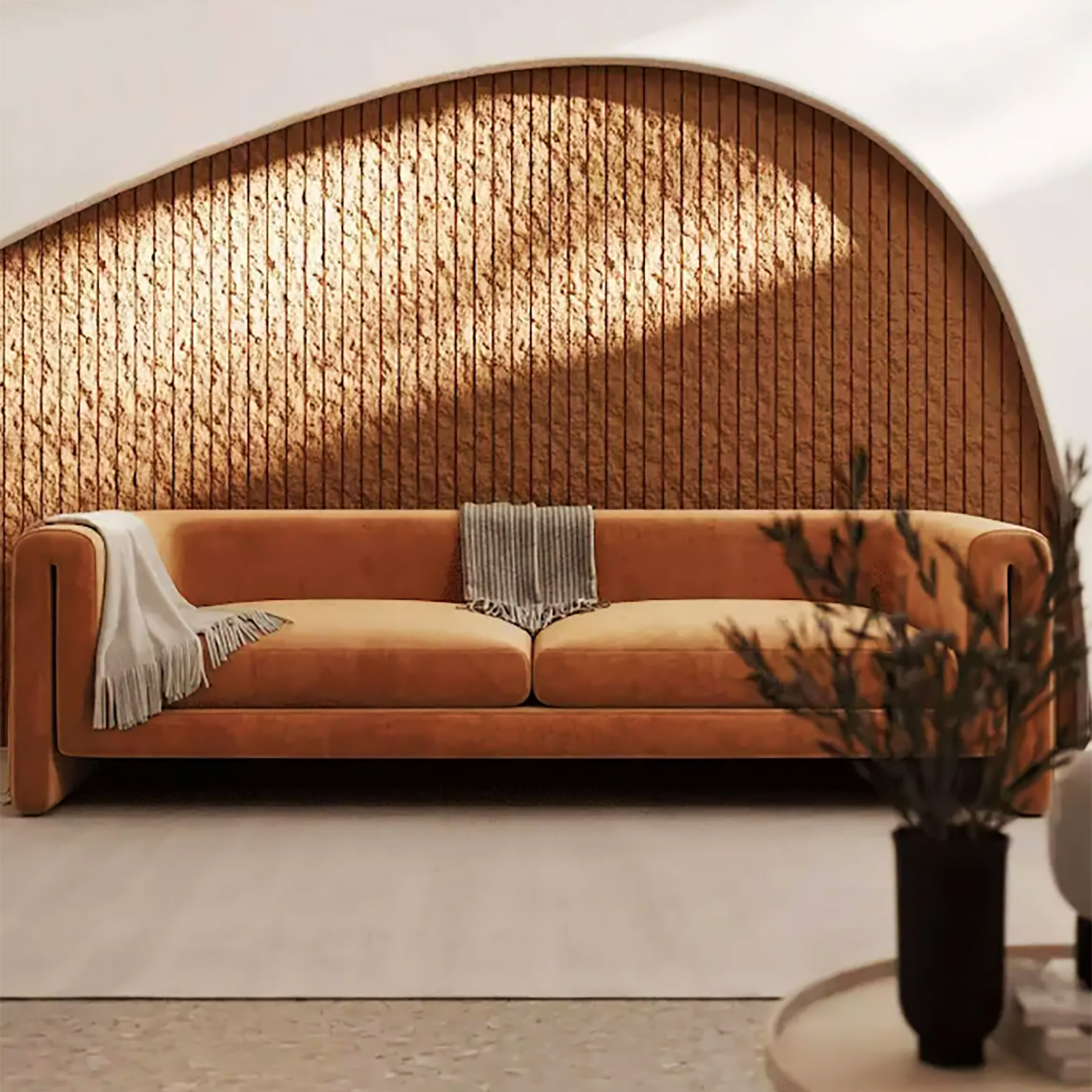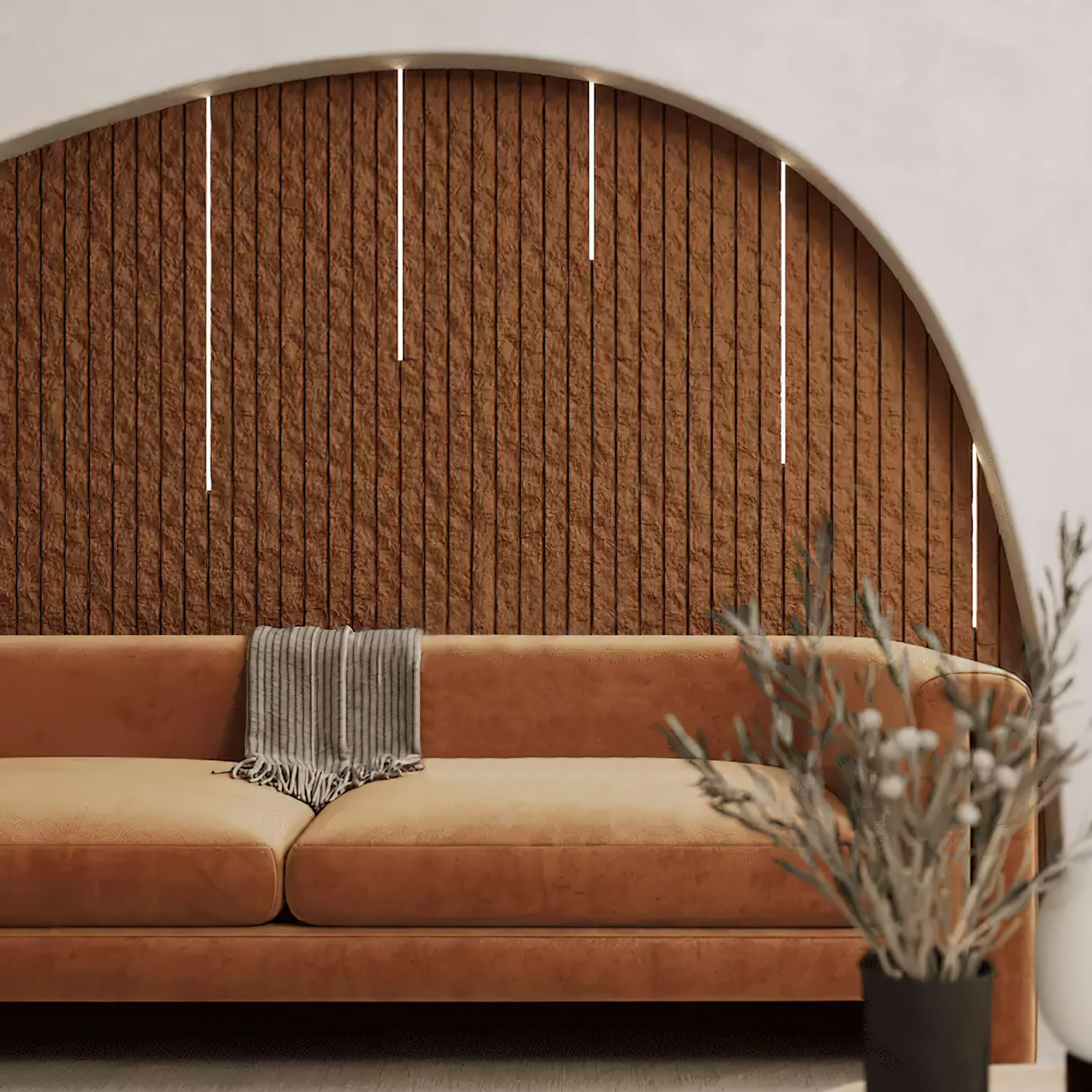Гіпсові панелі Stone rails пофарбовані в теплих світлих тонах органічно впишуться у середземноморських етностилях. Кам'яні рейки з гіпсу надаватимуть легкого настрою та невимушеності у вітальні чи спальні. Вмонтована LED підсвітка підкреслить кам'яний рельєф на заломлені променів, створюючи загадковий скельний ефект у кімнаті.