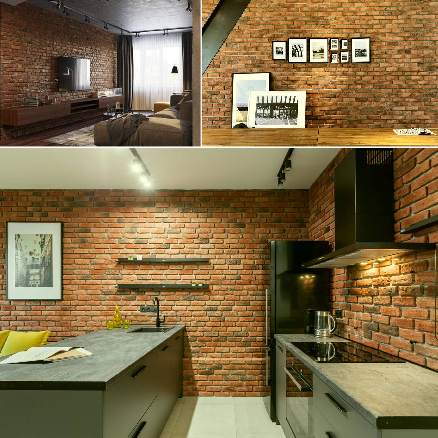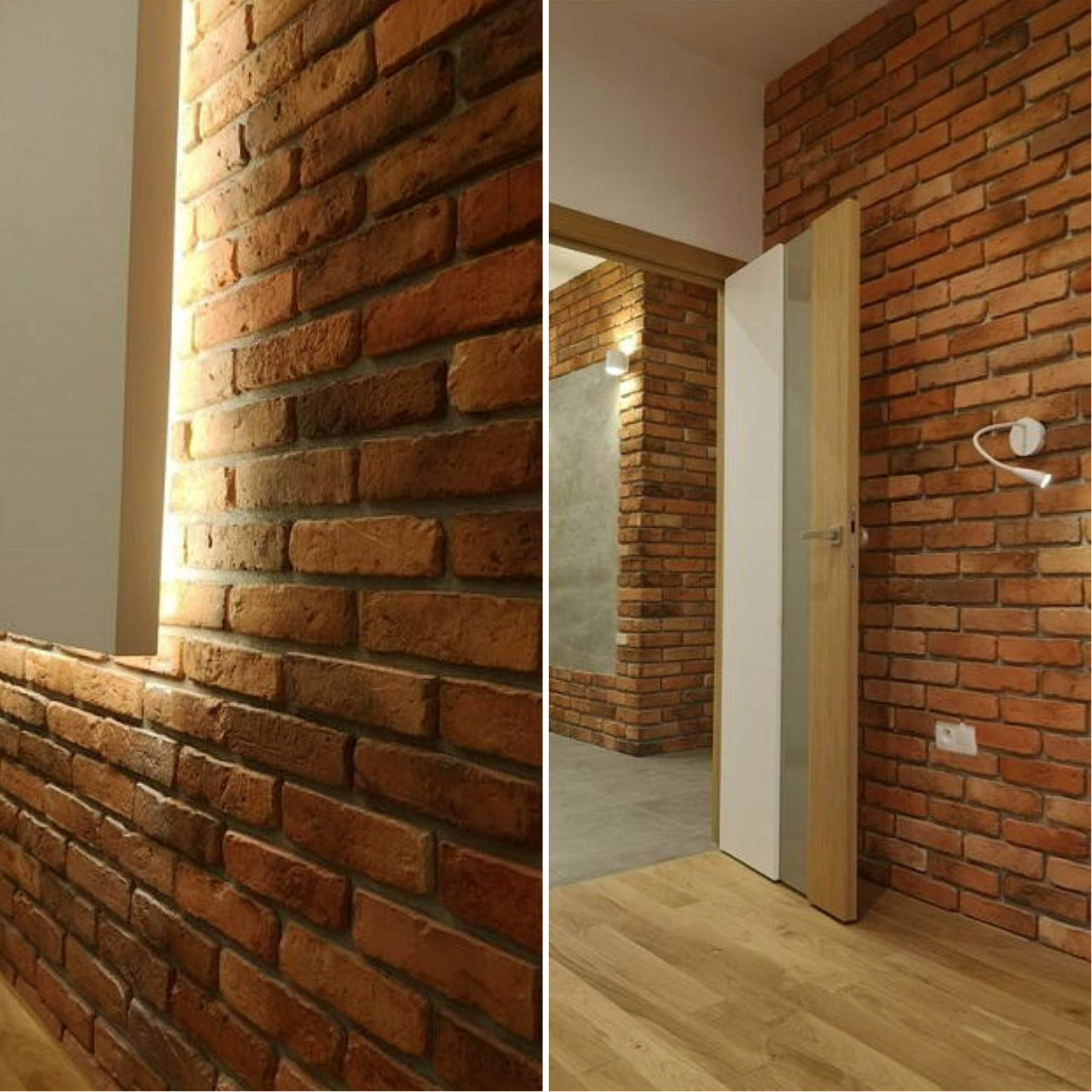 Суміш теплих пастельних тонів й неоднорідність цегляного рельєфу утворює оригінальну гру кольору та фактури в інтер’єрі. Тепла палітра коричневих, червоних, помаранчевих відтінків притягує погляд та візуально наповнює приміщення відчуттям гармонійного затишку.