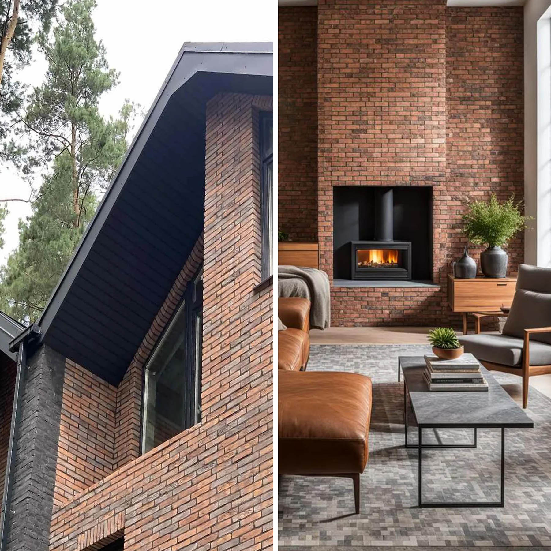 М'які коричневі пастельні тони цегли на стінах утворить живу затишну атмосферу інтер’єру в стилі Модерн, Кантрі, Етно. Елегантна фактура кольорової декоративної цегли наповнять простір приміщення вишуканістю в класичних інтер’єрах. Облицьована цеглою окрема стіна кухні, коридору, вітальні створить об'ємне сприйняття простору. Елегантність поєднана з високою витривалістю стане пріоритетом у виборі цегляного декору для фасадів та приміщень.