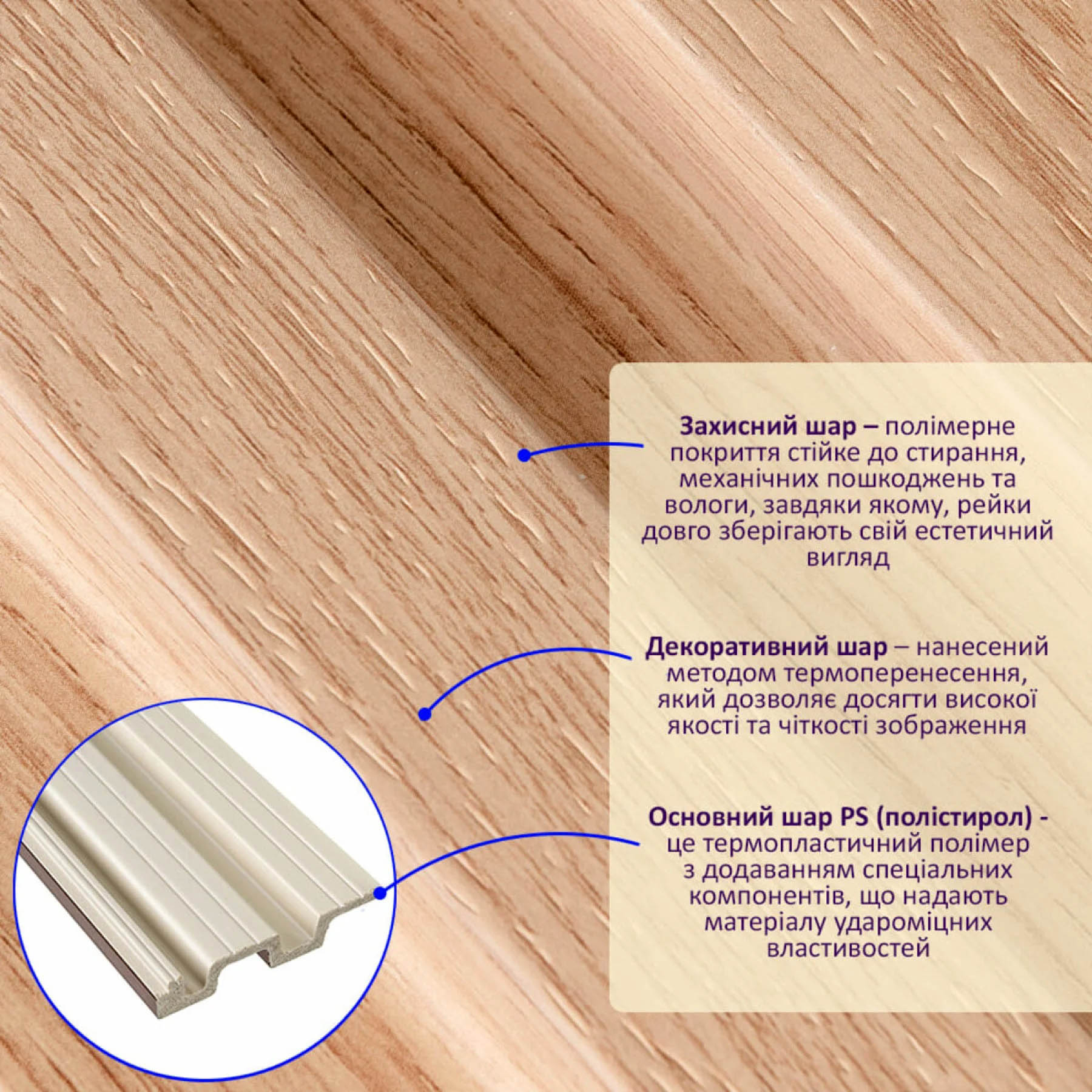 - Естетичний вигляд: Дерев’яна текстура світлих відтінків, об’ємний ефект.