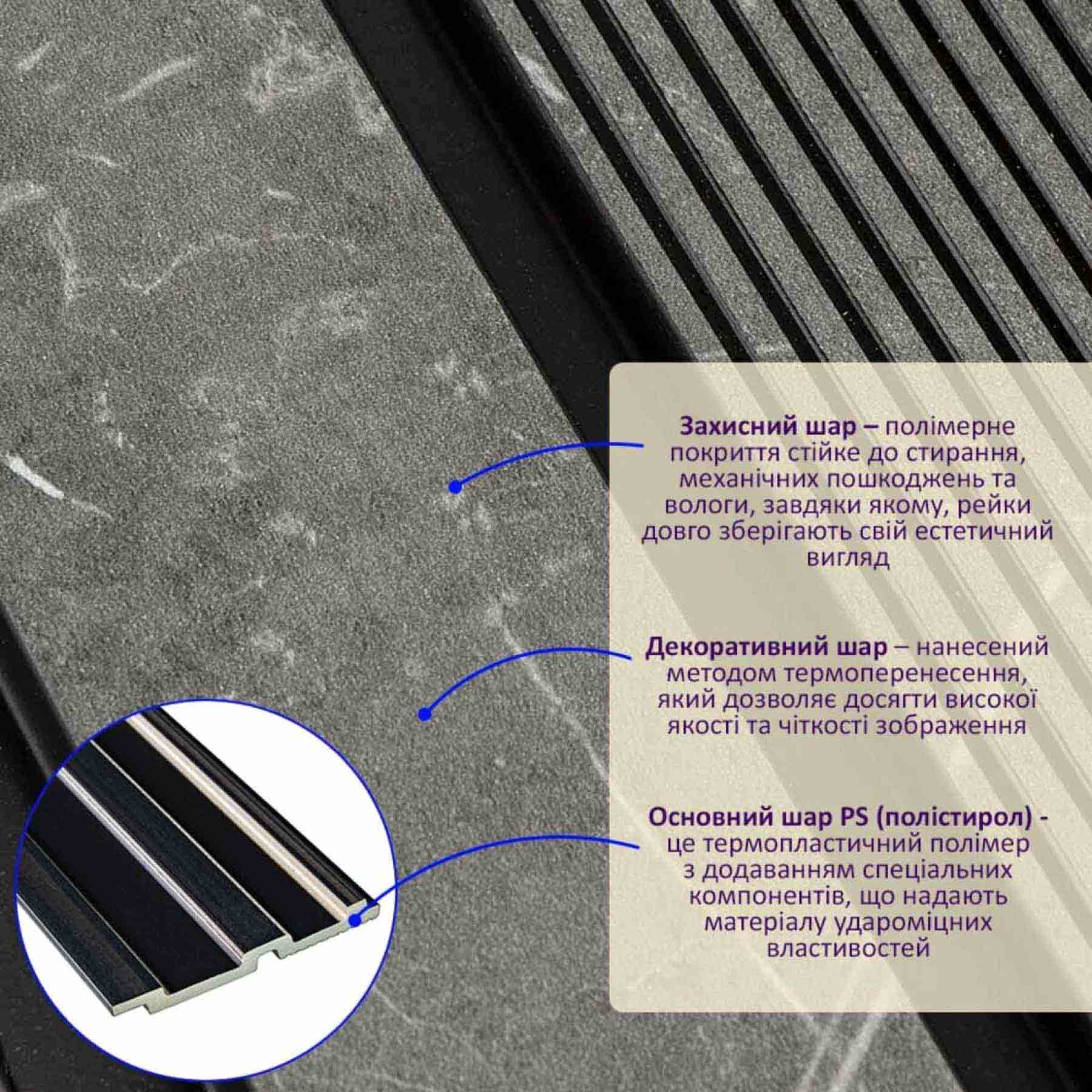 Декоративна рейка для стін PS 2900х120х12мм Сірий мармур - вологостійка панель з сучасним дизайном стане практичною покупкою для реалізації ремонту квартири або оновлення старих стін стильним декором.