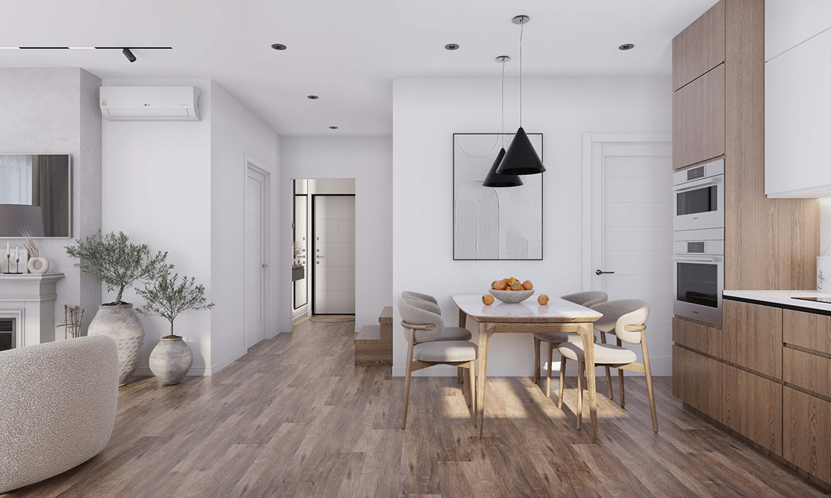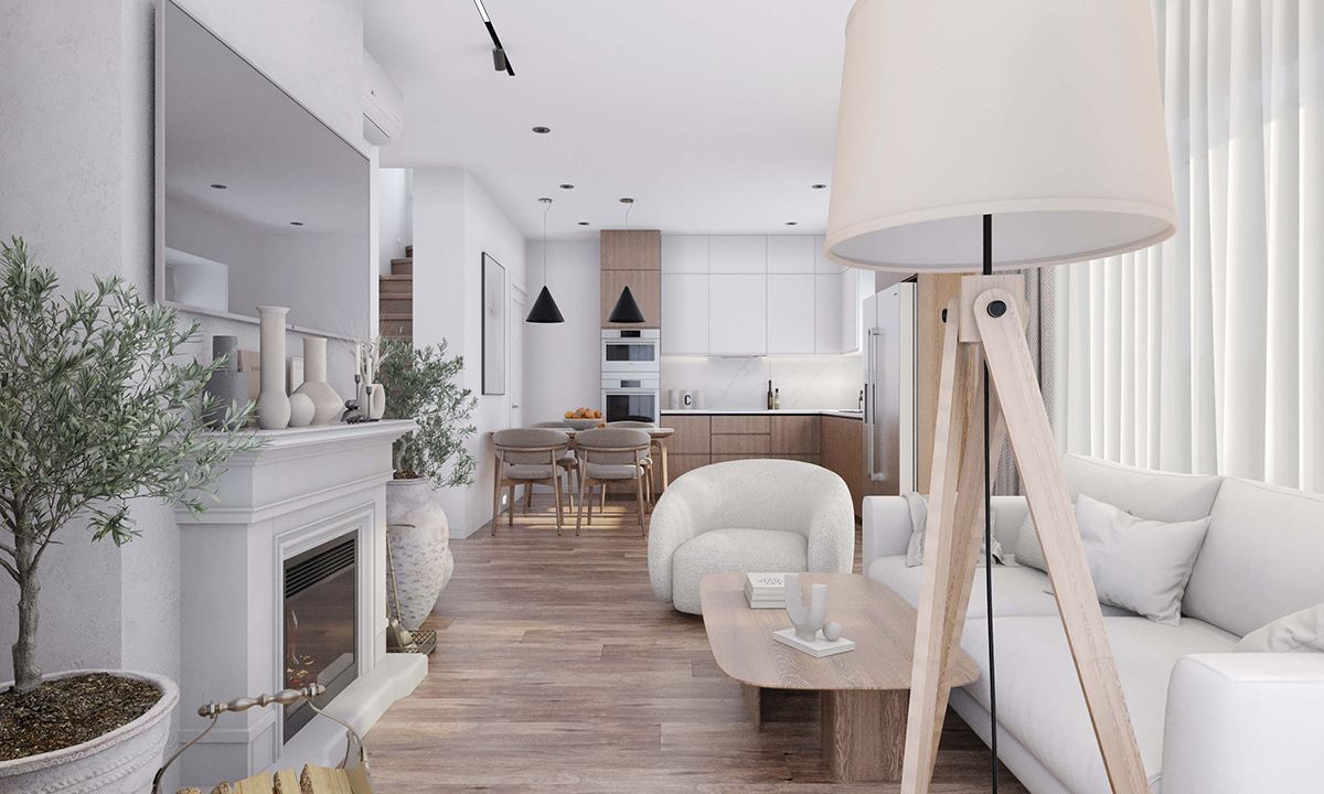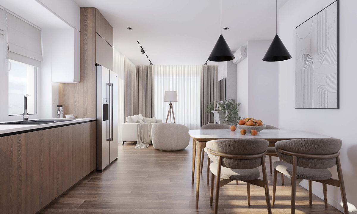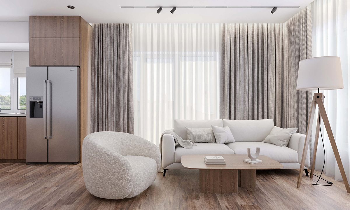 В даному дизайні використана плитка під білий мармур. Стіну біля обідньої групи, кухонна плита та обідній стіл мають однакову мармурову текстуру. Досконально підібрані текстильні елементи, диван та штори в студії. Дерев’яні меблі та вкрапленнями глянцевого мармуру все в комплексі утворює довершену композицію на світлому фоні. У великому приміщенні кухні-вітальні дизайнер створює функціональний та естетичний проєкт. Всі складові виконані в певних кольорових рамках. Виважене тональне співвідношення основного фонового кольору стін до решти елементів запорука ідеального дизайну. Наприкінці розставляються акценти: вази підібрані в тон, вазони з рослинами, мінімалістична графічна картина на стіні.