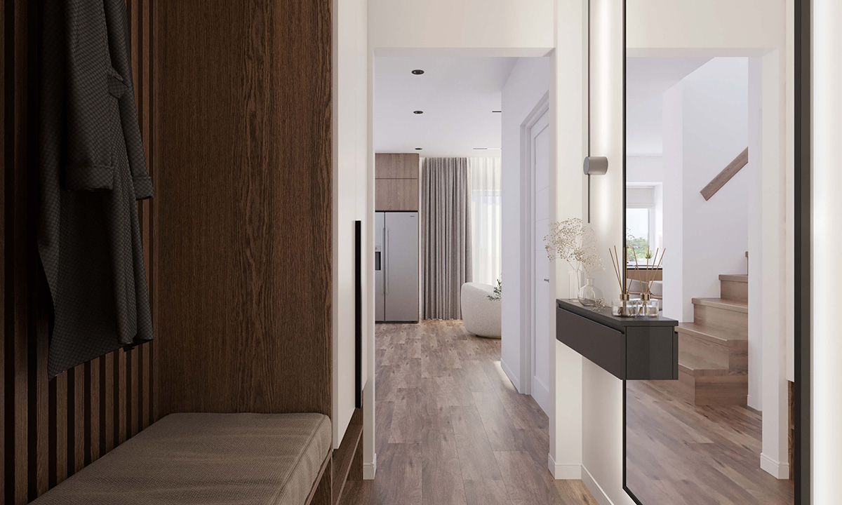 Створіть затишне середовище в білому кольорі в коридорі. Додайте максимум штучного освітлення, дзеркальні поверхні. Зазвичай коридор найтемніші частини дому, тому варто оснастити потужнішими світильниками. Дзеркало окрім своєї функції в прихожій візуально розширює простір. Прихожа виконана максимально зручно для верхнього одягу та взуття. Білі двері в коридорах виступають єднальним елементом. Невеликі абстрактні картини значно збагатять середовище.
