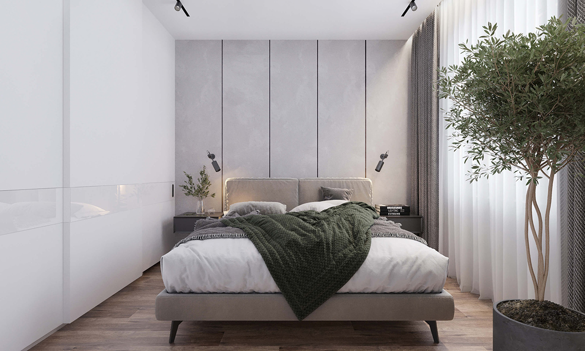 Важливу роль відіграє тональне співвідношення меблів. Прямокутні білі шафи, ліжко в спальні привернуть увагу на лаконічності та функціональності дизайну кімнати. Але щоб оживити середовище потрібно використати полиці, тумби, лампи нестандартних форм. Вони підкреслять вашу індивідуальність, нададуть унікальності.
