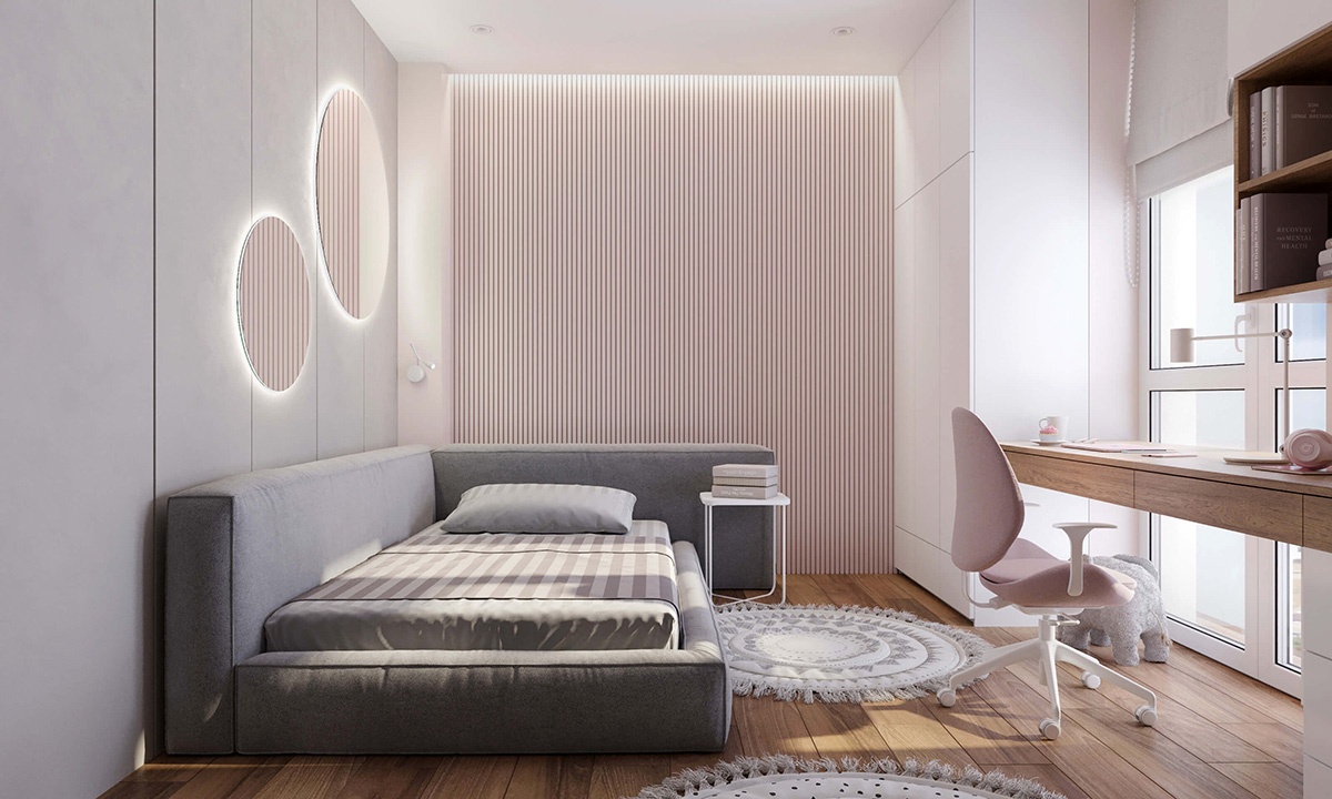 В такому випадку розглянемо дитячу для дівчинки шкільного віку. Стіни кімнати оздоблені рейковими панелями. Окрема стіна виділена декоративною штукатуркою «під бетон».