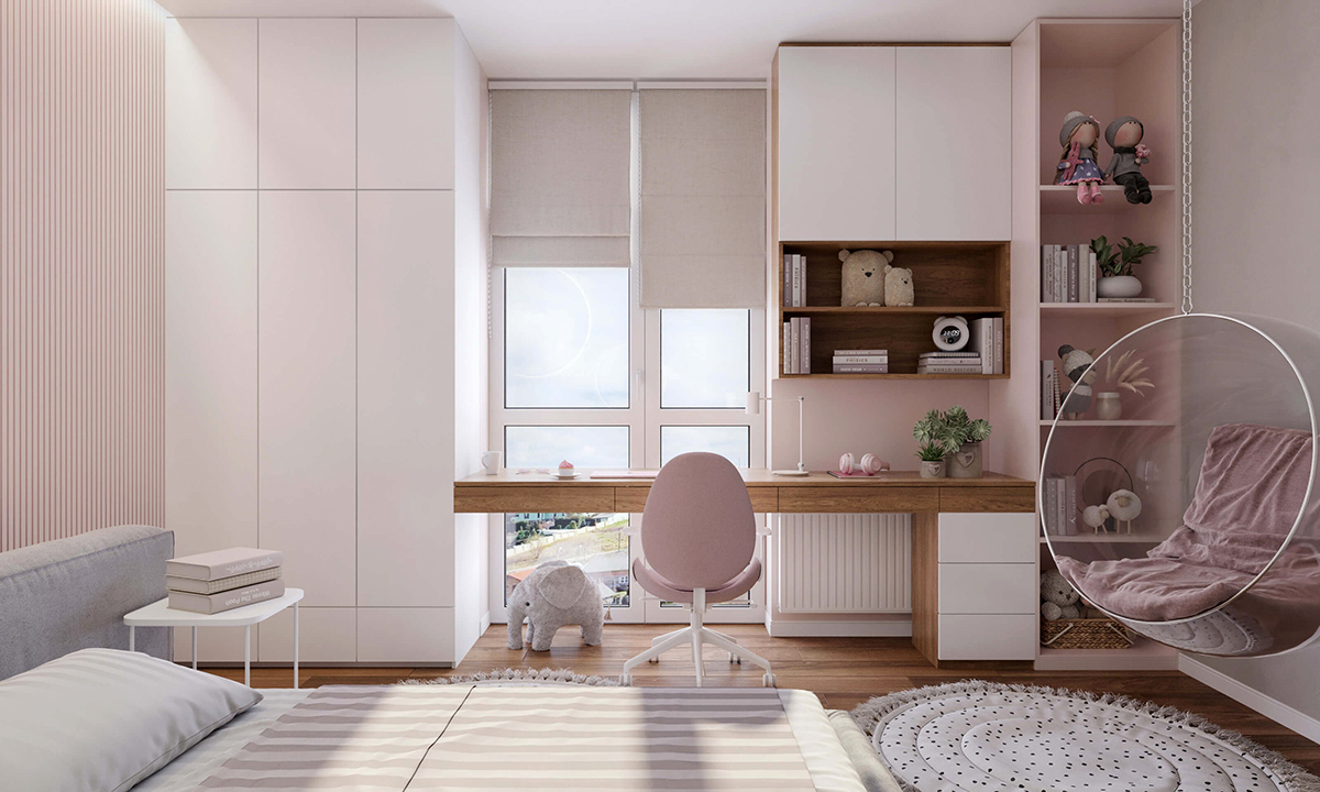 Блідо рожеві меблі органічно поєднуються зі світло сірими та молочними відтінками оточення. Освітлення варто розділити на основне та додаткове. Для зручності робочого простору письмовий стіл треба розмістити ближче до вікна. Додатково необхідно встановити настільну лампу.
