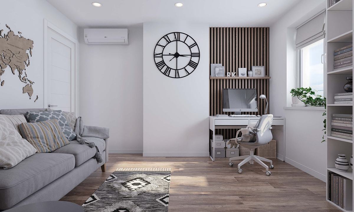 Кабінет в котеджі, великій квартирі місце де господар може усамітнитись для роздумів та виконання роботи. Дизайнерське рішення потребує максимальної функціональності всіх елементів. Окрім того, треба візуально створити настрій, який спонукатиме до роботи. Світлий інтер’єр кімнати в стриманих сірих відтінках в мінімалістичному стилі сприяє зосередженості на певному завданні. Слід додати декоративних рейкових панелей з вираженою текстурою дерева або оздобити декоративною гіпсовою цеглою.
