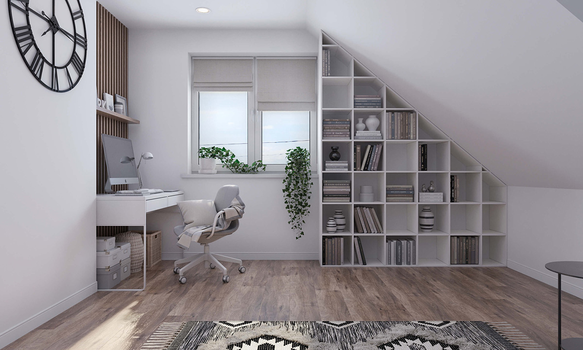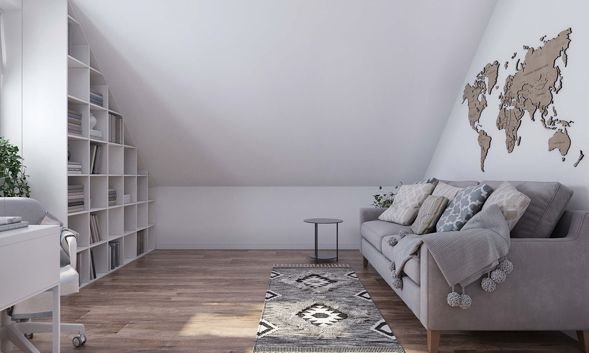 Такий стриманий декор надасть кабінету характерної індивідуальності та не сприйматиметься як безликий сірий офіс. Якщо у вас мансардне приміщення дизайнеру потрібно використати корисну площу та розмістити меблі оптимально зручно. Організувати легкий доступ до кожного кутка. Акцентом на вільній стіні може бути графічна картина, карта світу.