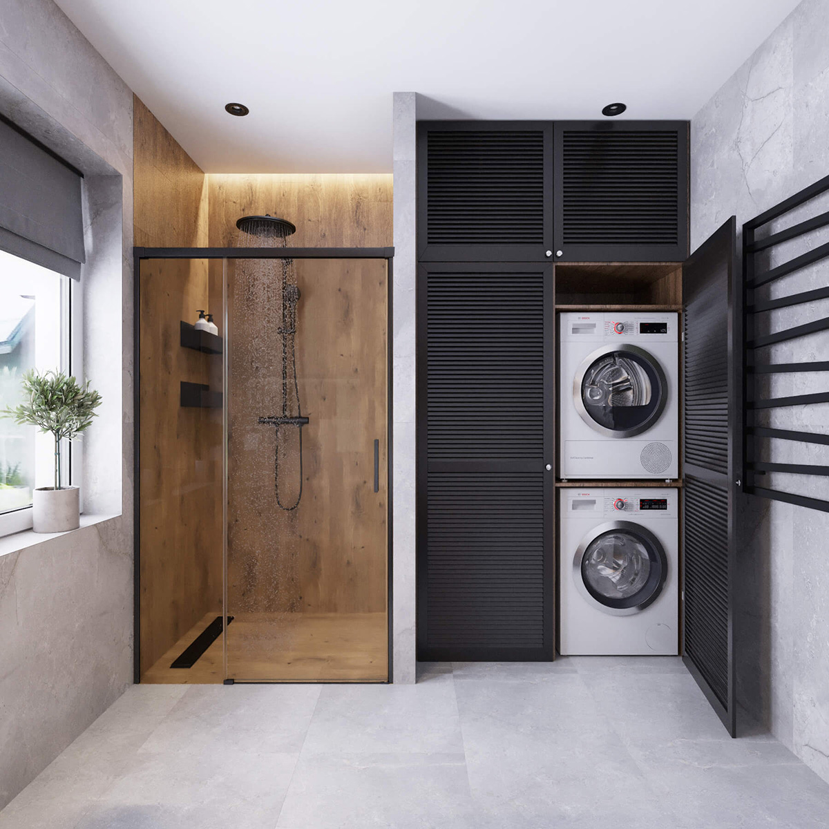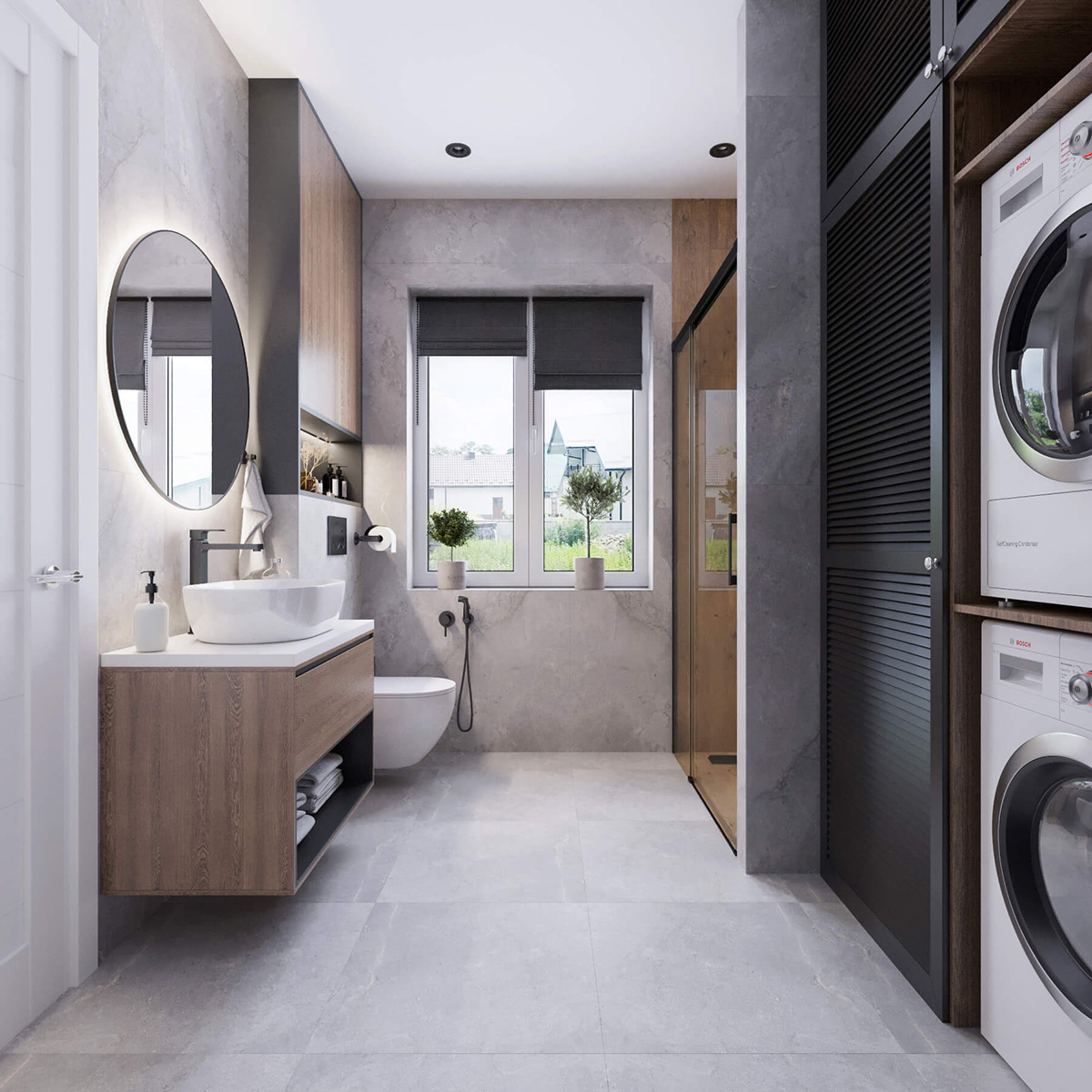 Якщо у вас приватний будинок чи двох рівнева квартира присутні 2 санвузли. На першому поверсі розміщена душова кабіна та побутова техніка (пральна, сушильна машини) Ванна виконана в загальному стилі будинку. Тут переважає широкоформатний сірий керамограніт, що імітує бетон. Душова облицьована плиткою текстуровану під дерево. Холодна та насичена тепла тональність органічно поєднується в невеликому просторі санвузла.