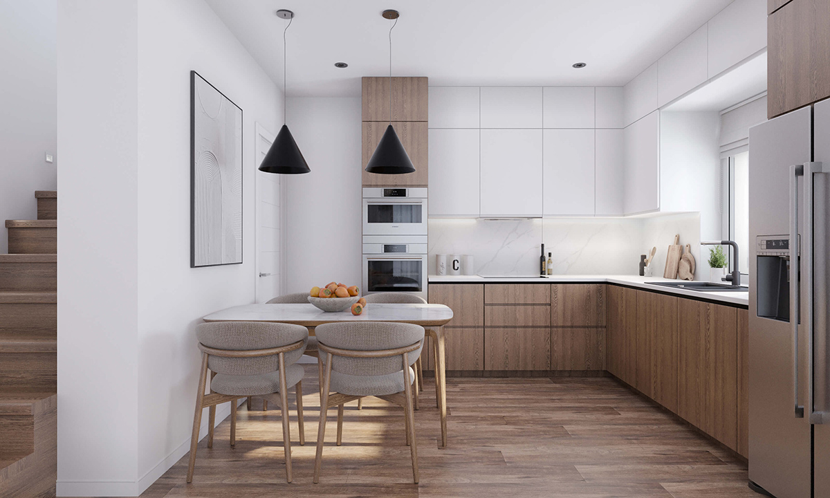 Світле оздоблення стін – чудовий фон для цікавого декору. Крім того, воно завжди актуальне. Білі, кремові, бежеві меблі додають приміщенню елегантності, гармонії. Дерев'яна текстура на меблевих фасадах роблять домівку теплішою. Також, зверніть увагу на ергономіку та функціональність. Використовуйте якомога більше вбудованих систем зберігання, аби раціонально розподілити доступну площу.