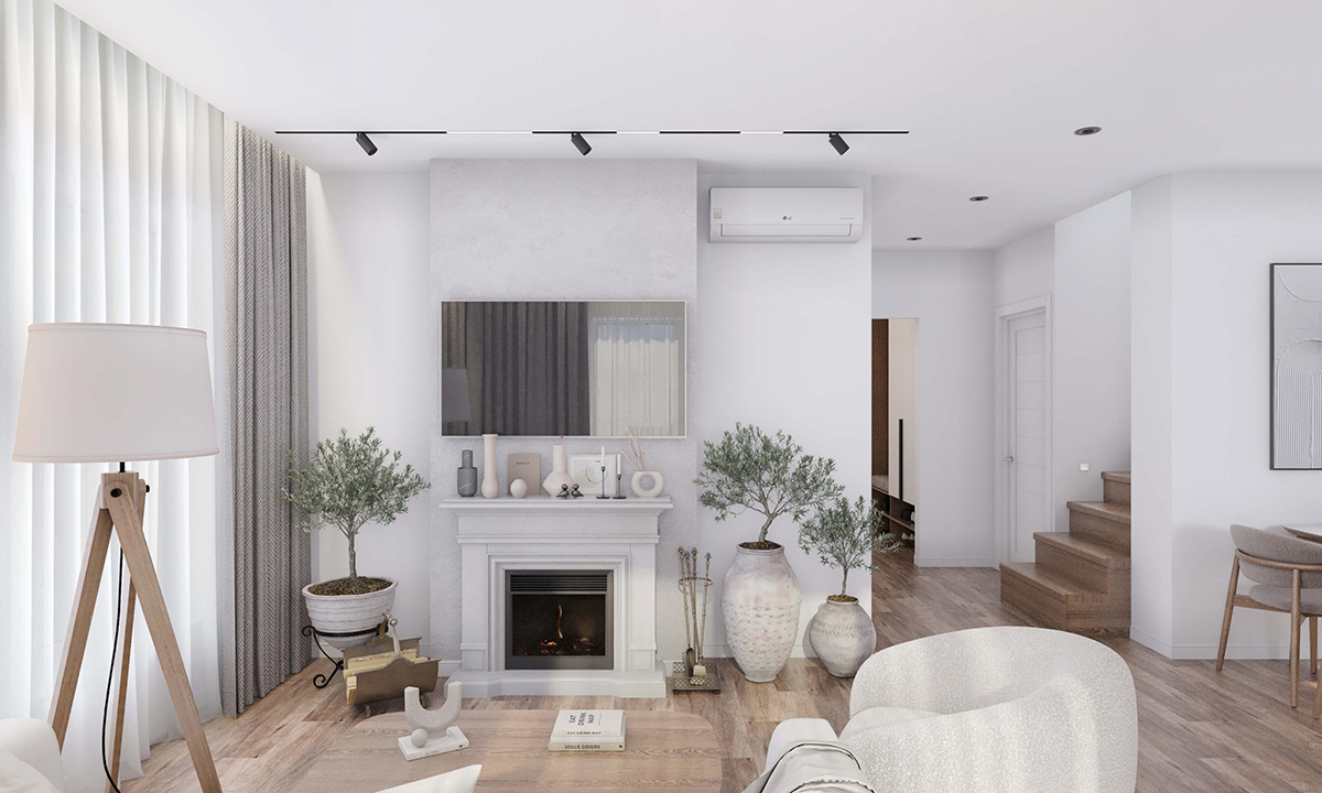 Ледь кремові стіни та біла стеля утворюють ефект повітряності. Камін в центрі вітальні виступає головним елементом кімнати. Стіна позаду каміна оздоблена венеційською штукатуркою. Хороше рішення – оздобити частину площини декоративним покриттям. Це може бути «Гротто», «Марморіно», гіпсова цегла світліших відтінків.