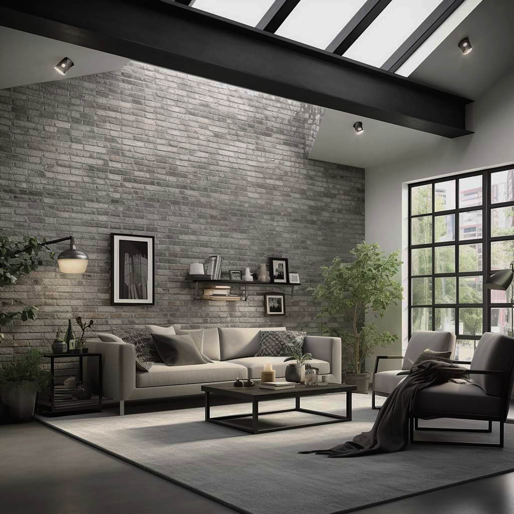 Цементно-піщана плитка виступить цікавим та практичним настінним декоративним покриттям індустріального забарвлення. Сірий грубий рельєф цегли поєднується з декоративною штукатуркою під бетон. Доповнивши приміщення дерев’яними та металевими акцентами, оригінальними меблями та світильниками утвориться простір в стилі Лофт.