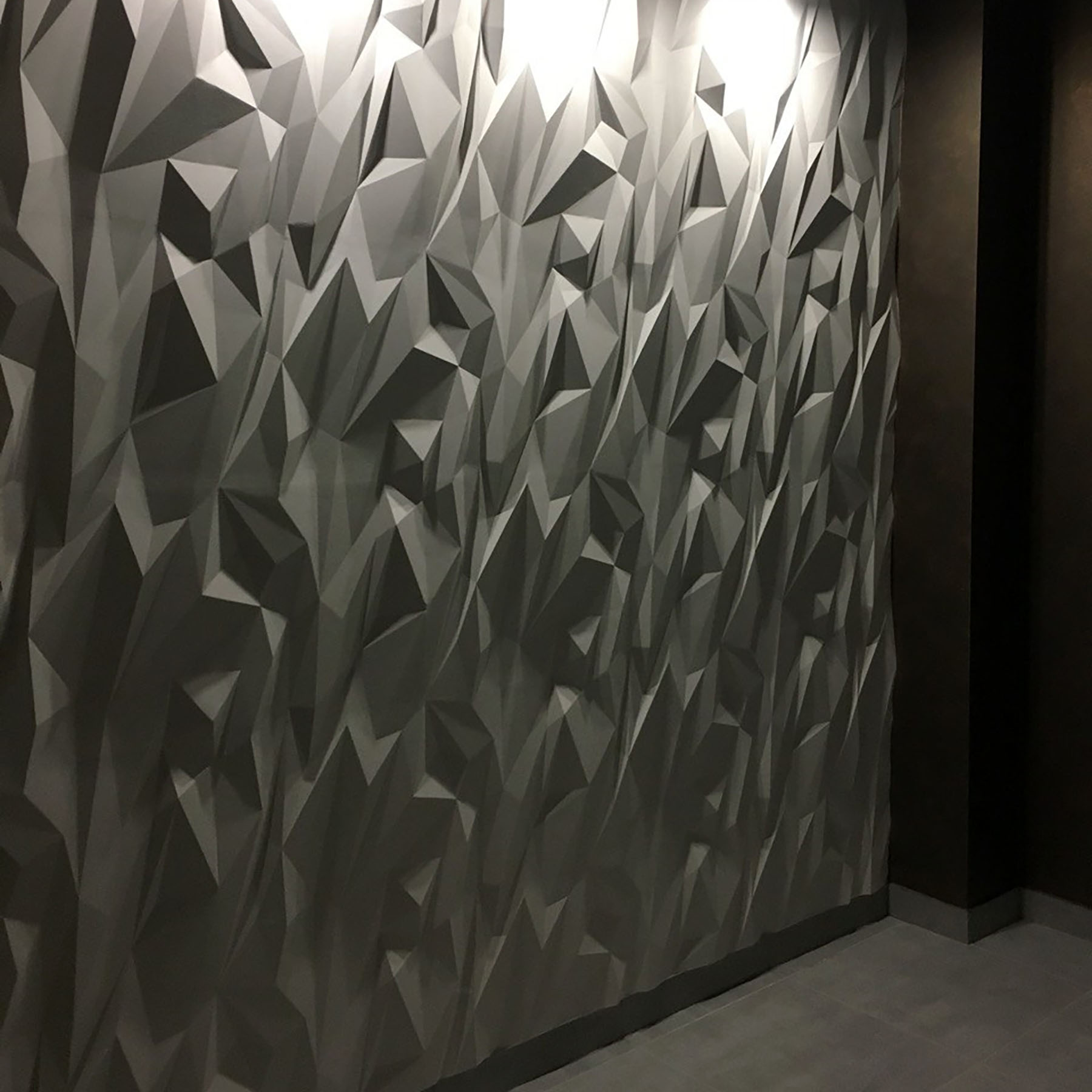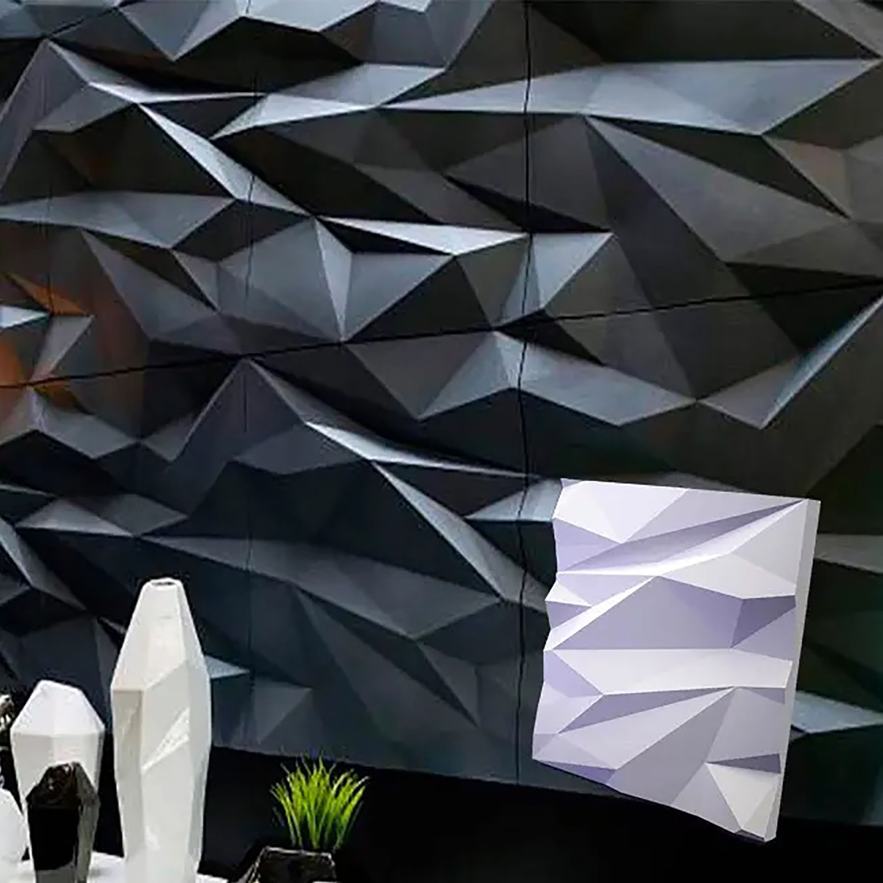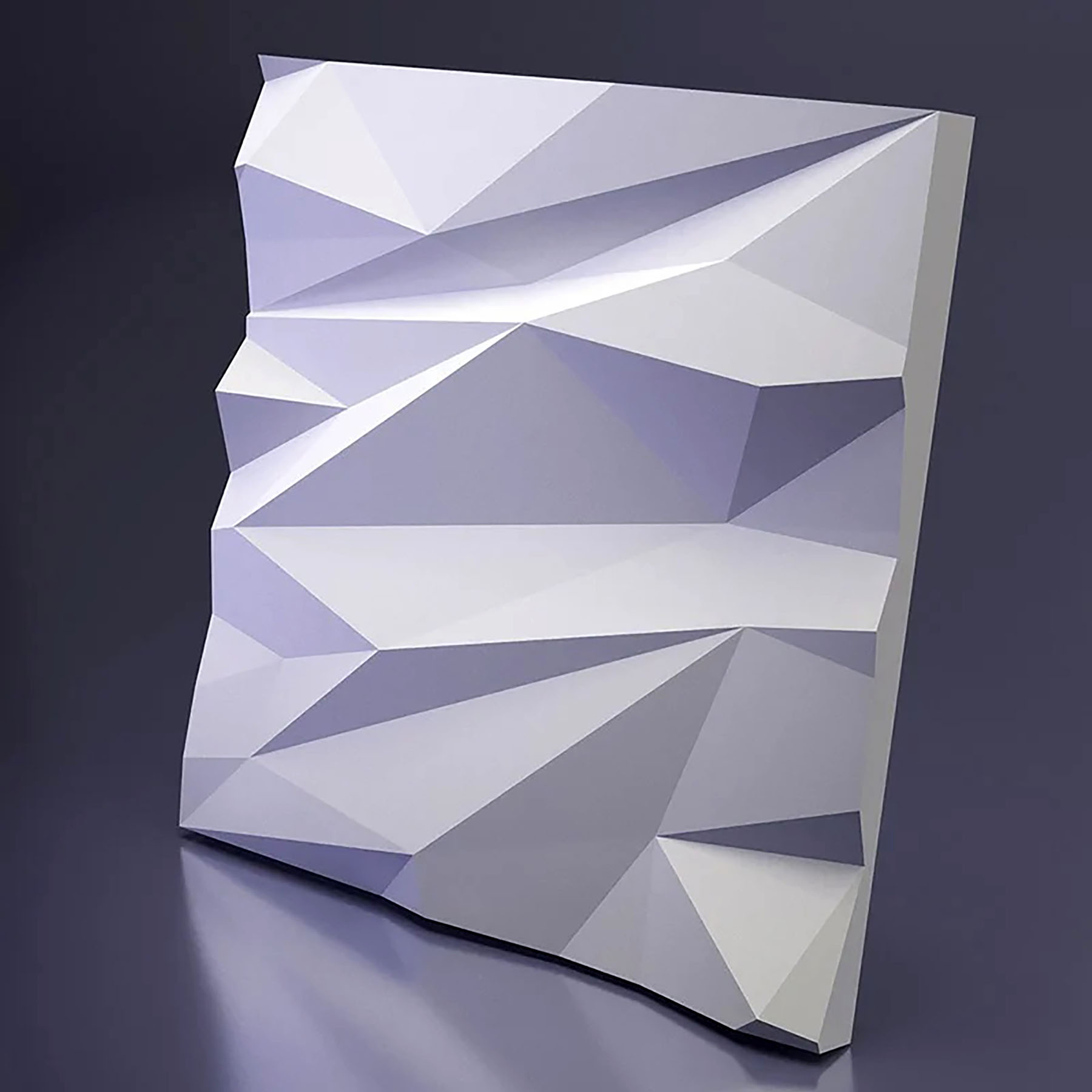 Гіпсові 3D-панелі «Стелс» сама назва говорить про швидкість, рух прогресу та новітні технології, які популярні у сучасних дизайнерських рішеннях у квартирі, офісі, клубі чи стильному кафе. Декор складається з двох елементів розміром50х50 см, що при монтажі утворює невелику повторювальність скелеподібного рельєфу. Чіткі кути зламів трикутних площинок поверхні під певним кутом освітлення створюють оригінальний візуальний ефект.