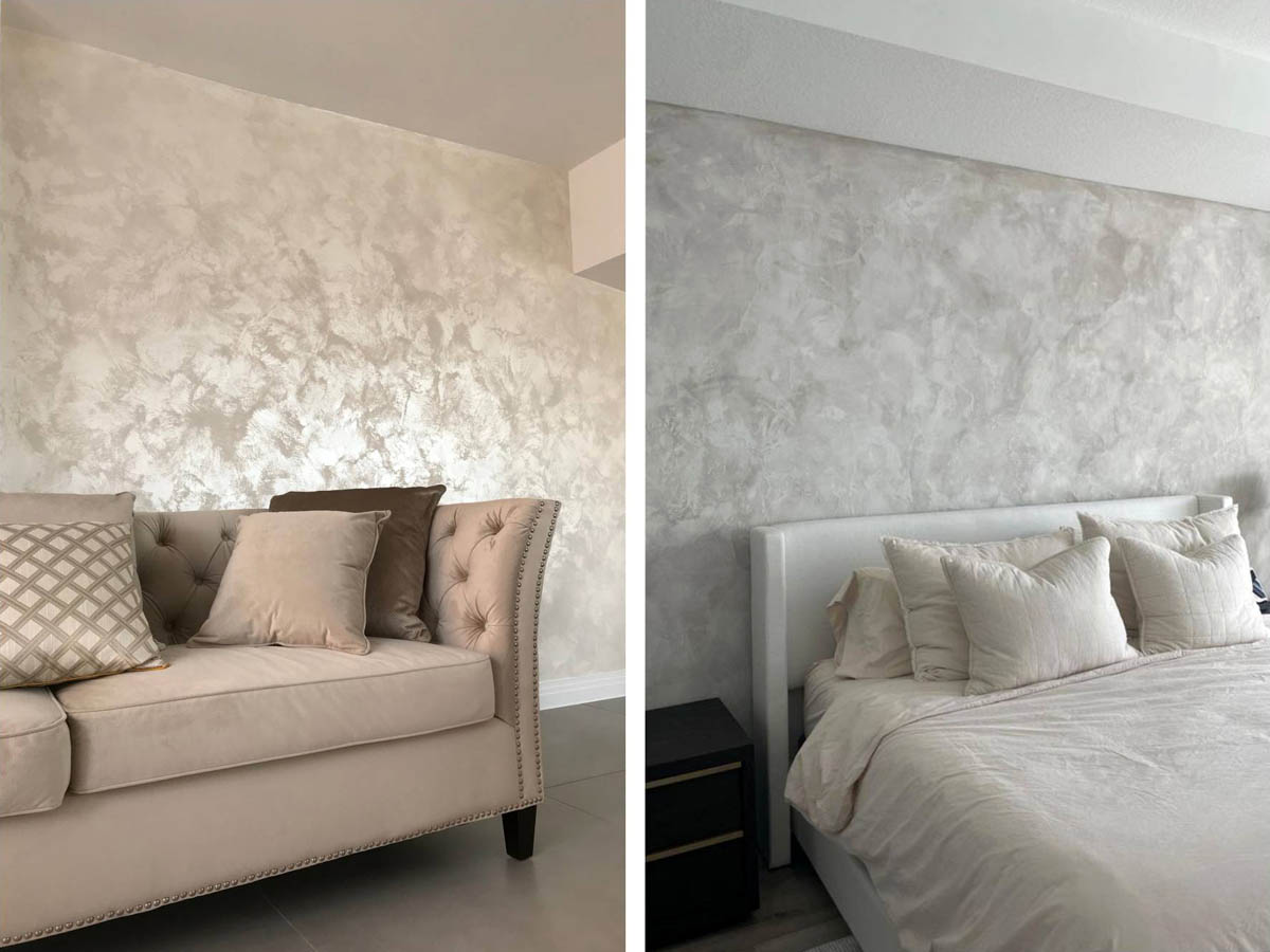 Ця оксамитова декоративна штукатурка дарує стінам справжній шовковий перелив: делікатну текстуру, благородний блиск, який ніколи не буває нав'язливим. Секрет — у спеціальних перламутрових пігментах та техніці нанесення. Кожен шар наноситься венеціанською кельмою, пензлем даруючи ту саму "шовковистість", яку можна відчути навіть поглядом.