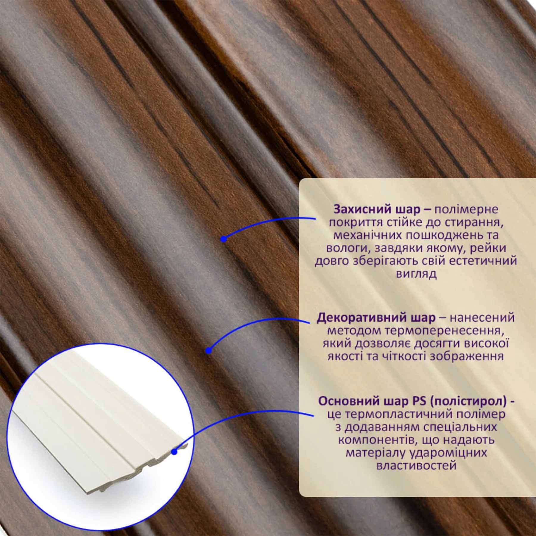 Рейки «під дерево» хвилястої форми у розрізі мають заокруглені кути, що додає класичного шарму декору. «Бронзовий венге» елегантний декор для класичних дизайнерських рішень у квартирі чи офісі. Реалістична вишукана текстура та плавний рельєф рейкового декору додає аристократичного забарвлення в домі.