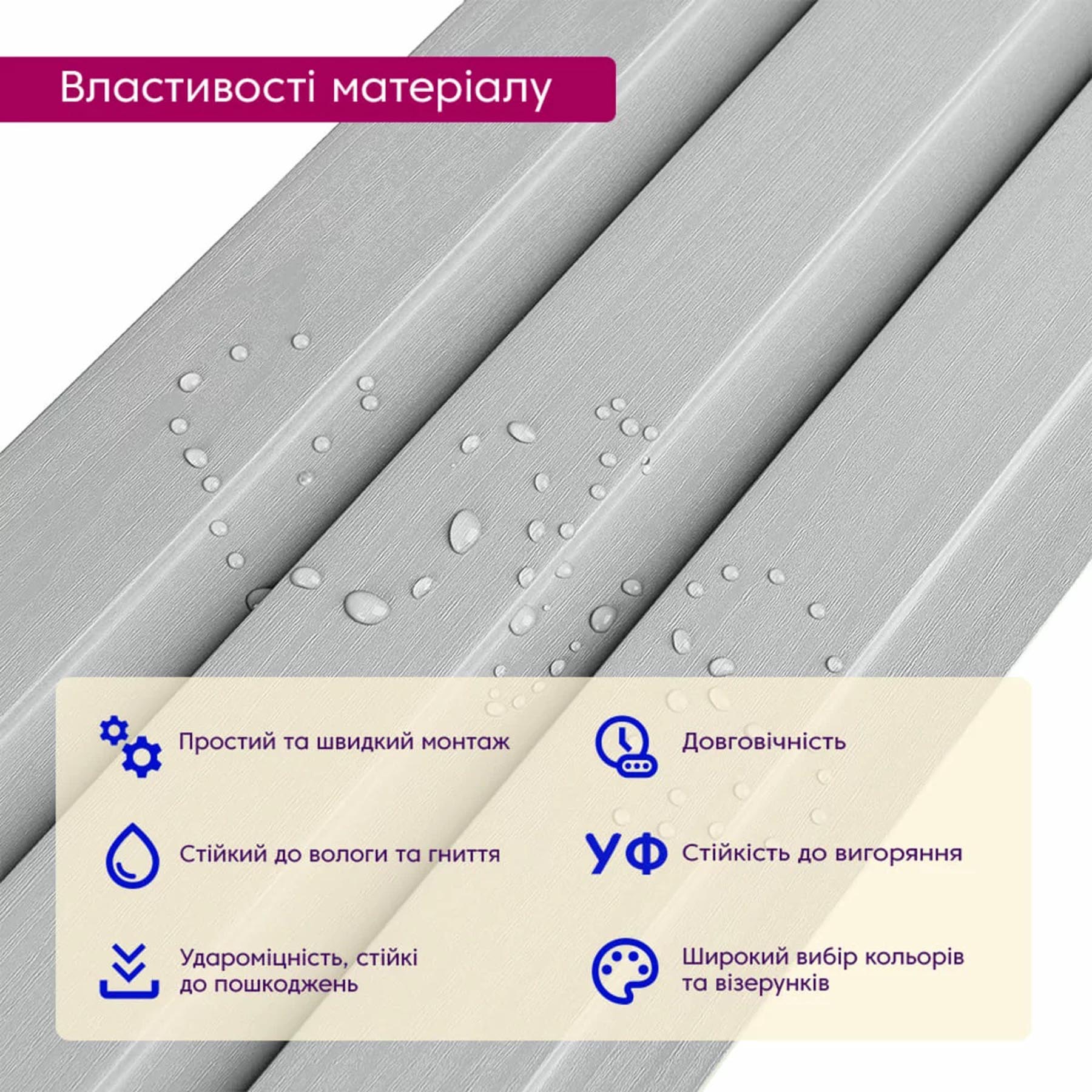 - УФ-захист – спеціальне покриття блокує руйнівний вплив ультрафіолету, завдяки чому первинний колір і текстура залишаються без змін роками.