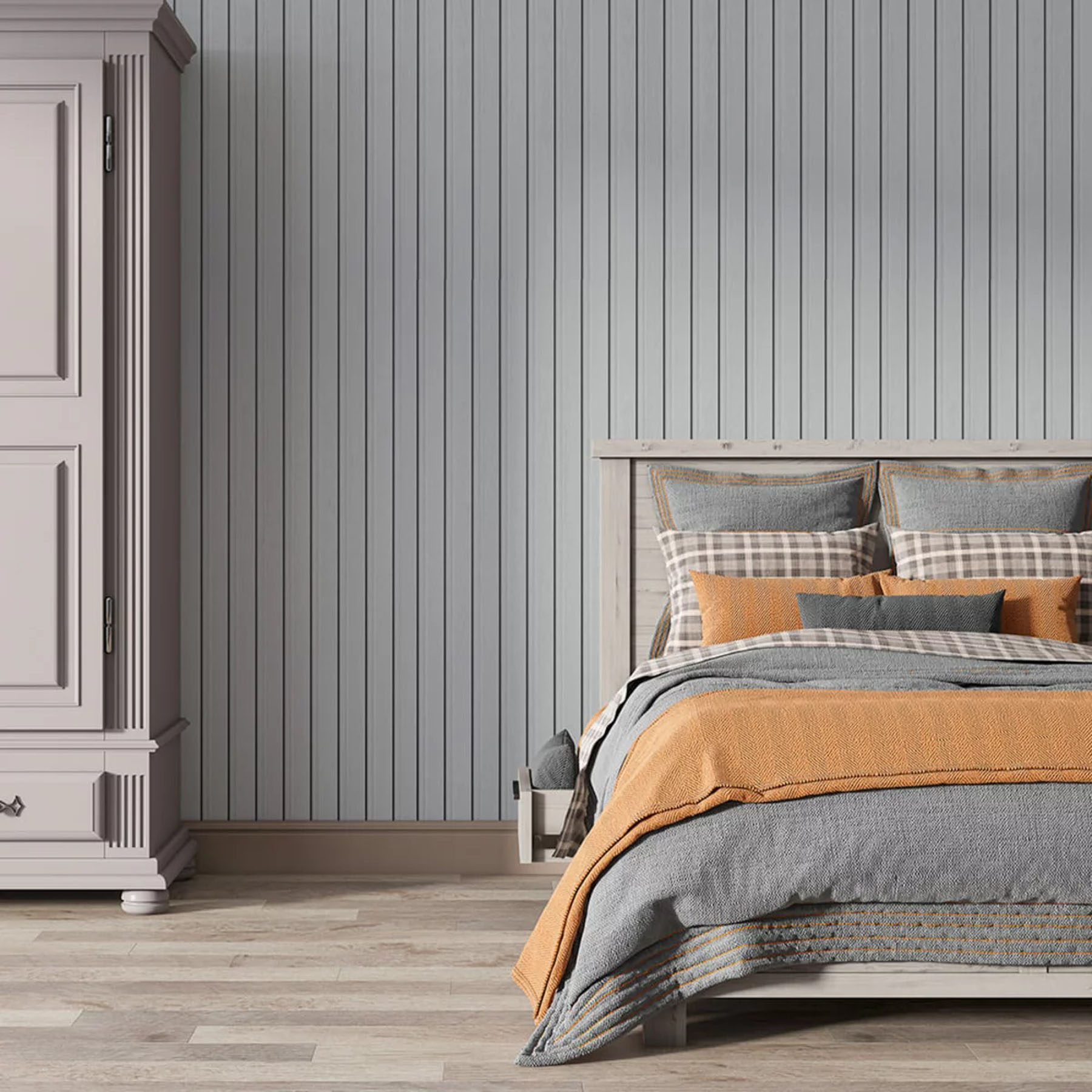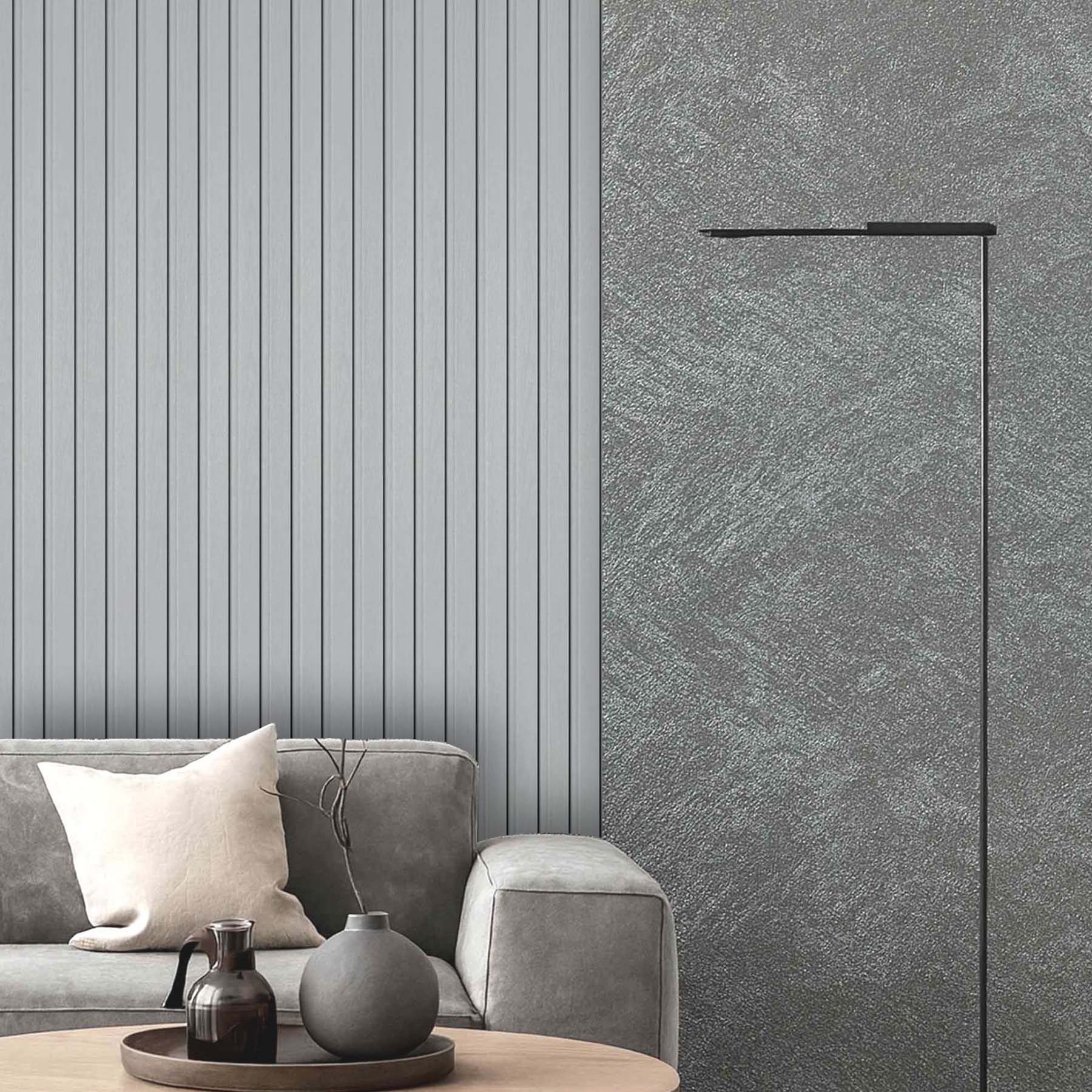 Колір та текстура: Світло-сірий відтінок з делікатною деревною текстурою. Поверхня має м'який матовий тон із ледь помітним малюнком волокон, що нагадує вибілене або пофарбоване дерево. Гладенька фактура з тонкими вертикальними лініями створює спокійну, нейтральну основу для сучасних інтер'єрів у скандинавському або мінімалістичному стилі. Універсальне рішення, що поєднується з будь-якою кольоровою палітрою та підкреслює простір світлом.