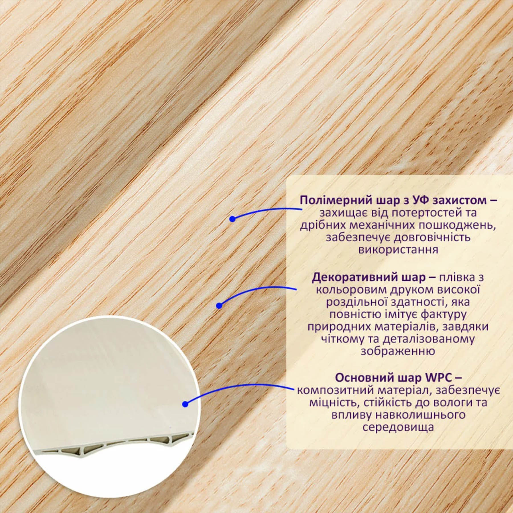 Базовий шар – композиція деревних волокон та полімерів, гарантує високу міцність конструкції, відмінну вологостійкість, стабільність при різних температурних режимах.