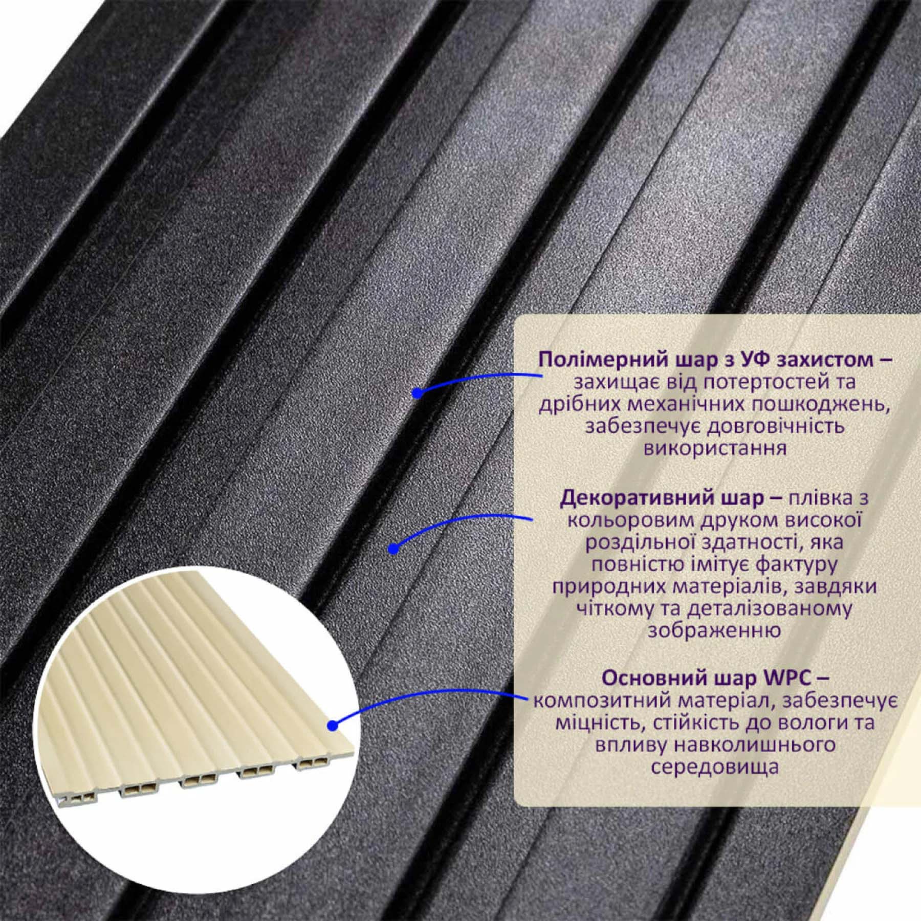Декоративна стінова рейка WPC 150x9x3000 мм Антрацит - естетичний вибір для тих, хто шукає довговічну альтернативу фарбуванню чи шпалерам у стилі лофт або мінімалізм. Доставимо продукцію у всі населені пункти України на вказану адресу Покупця до дверей.