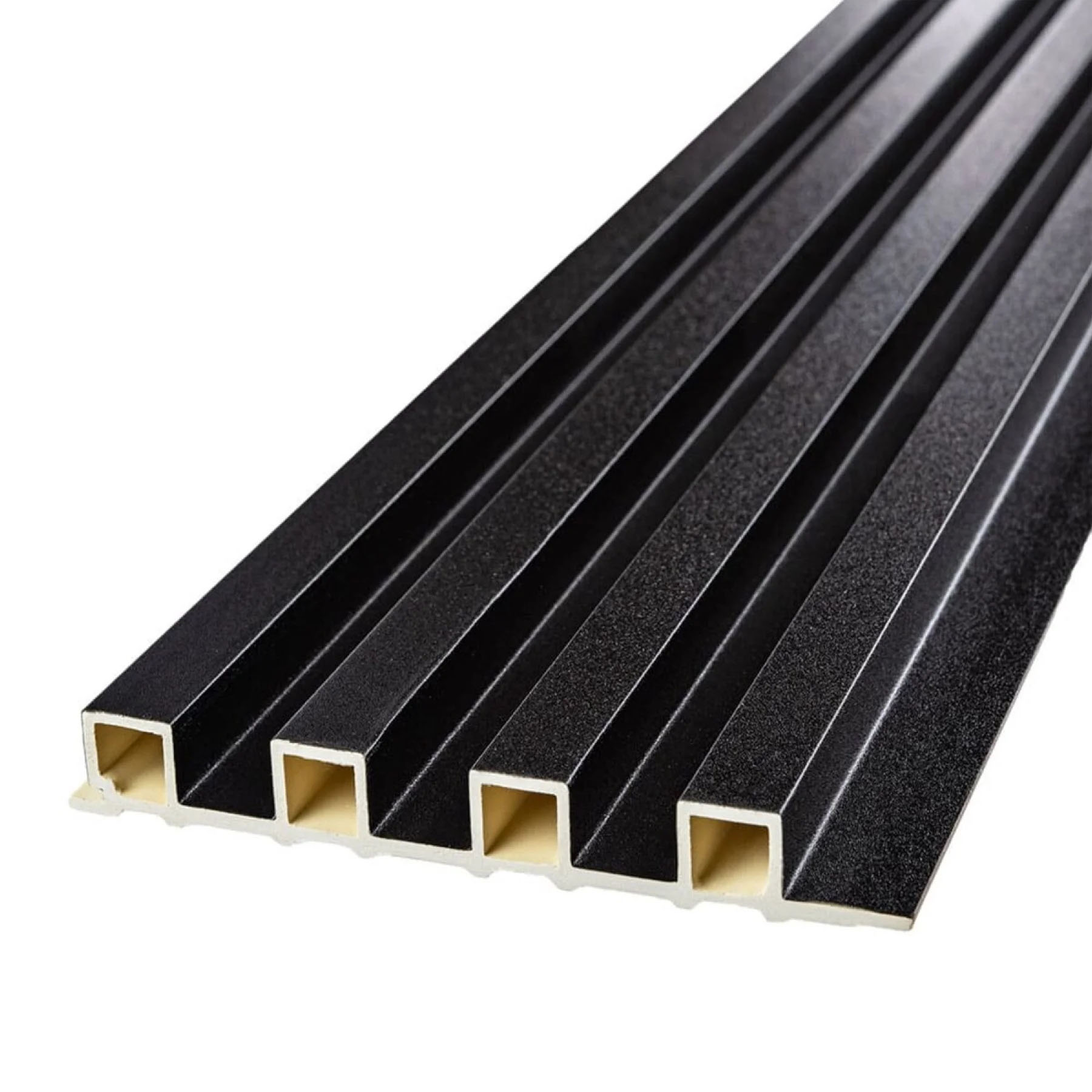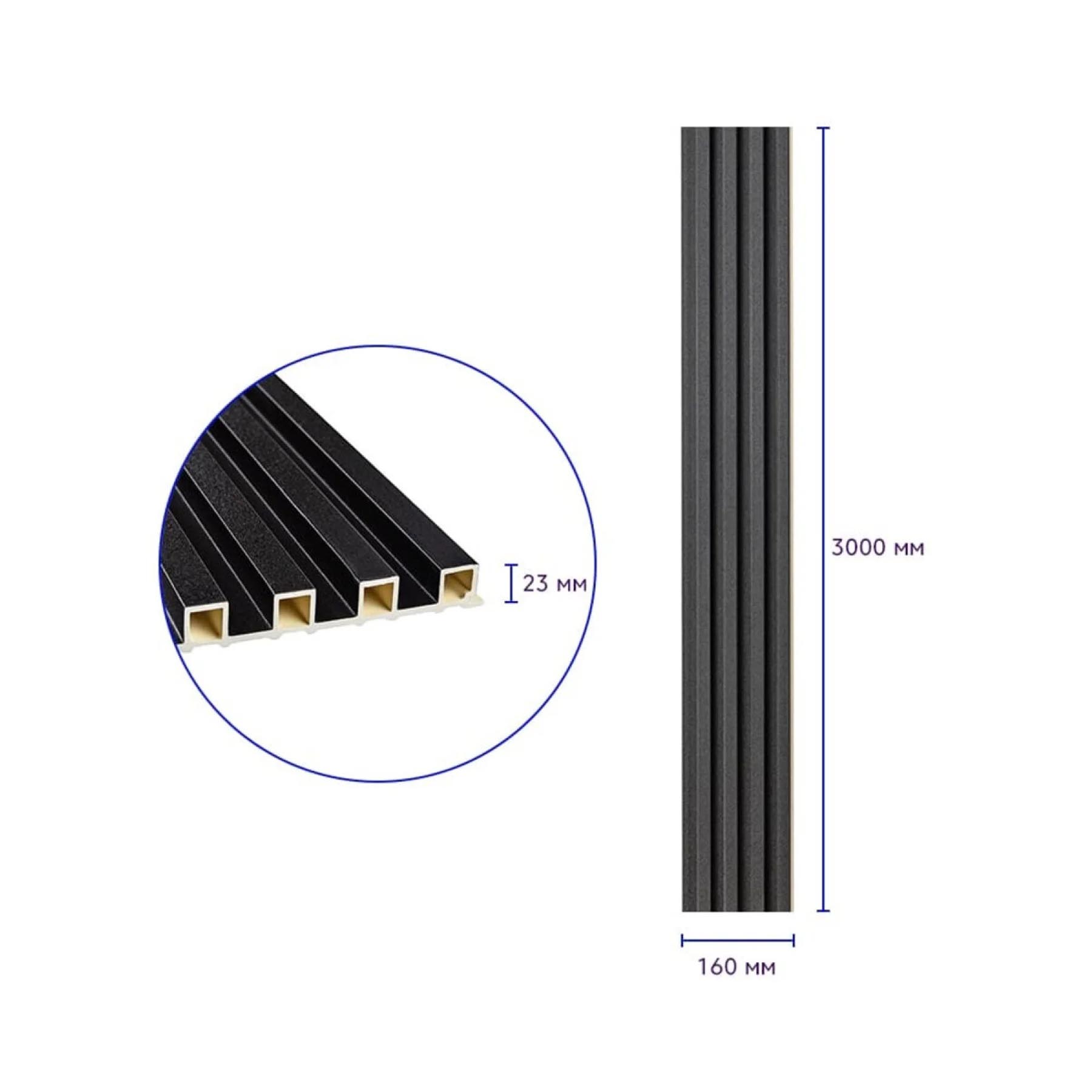 Сучасні стінові рейки WPC для внутрішнього оздоблення стануть головним візуальним акцентом, додаючи інтер'єру глибини та архітектурної виразності. Товщина 23 мм рейки створює потужний 3D-ефект в стильному темному виконанні. Насичений колір «Антрацит» впишеться в інтер’єрах в стилі лофт чи контемпорарі, роблячи простір візуально дорожчим та затишнішим. Триметрова довжина рейкової панелі дозволить оздобити стіни, створюючи бездоганний вертикальний рейковий декор на поверхні.