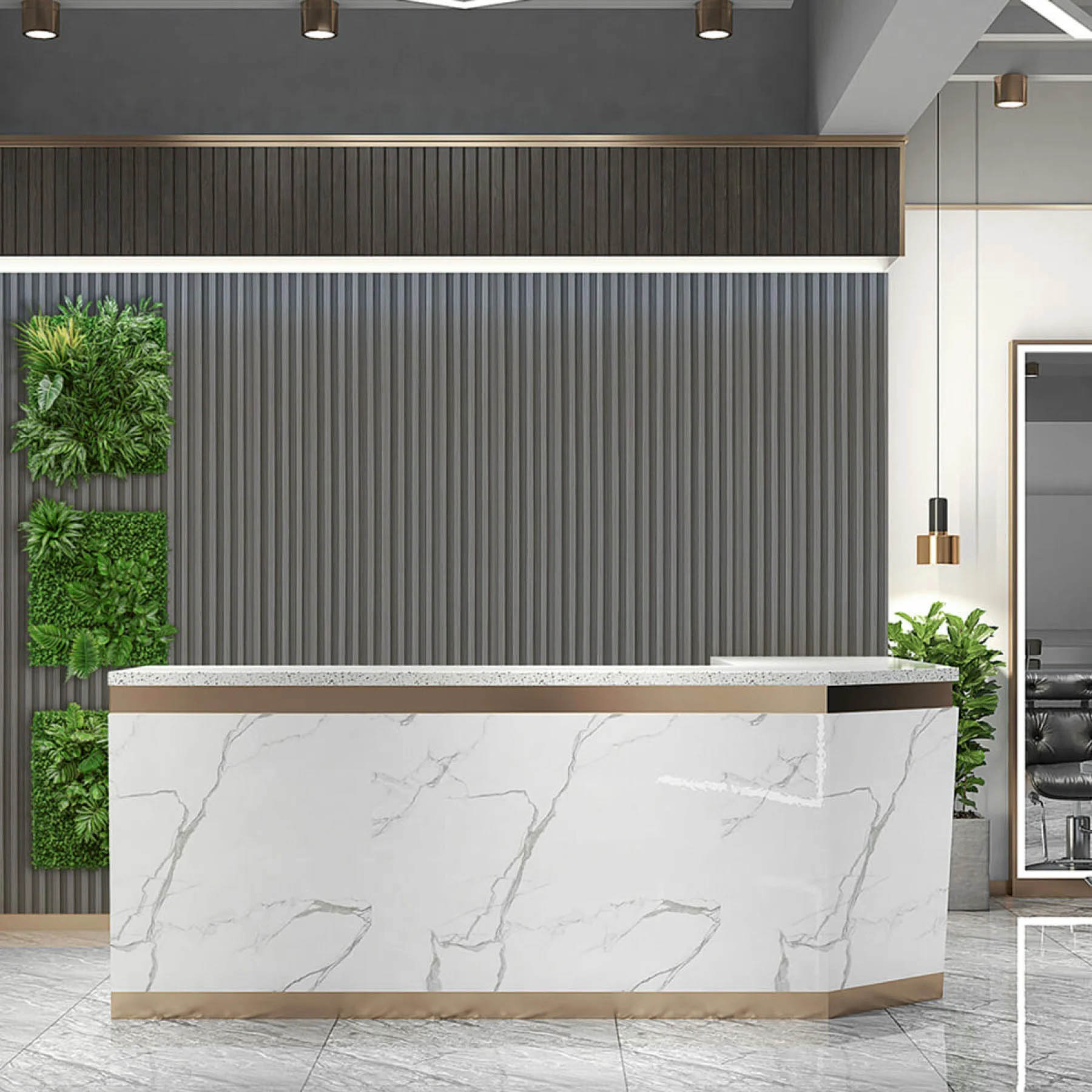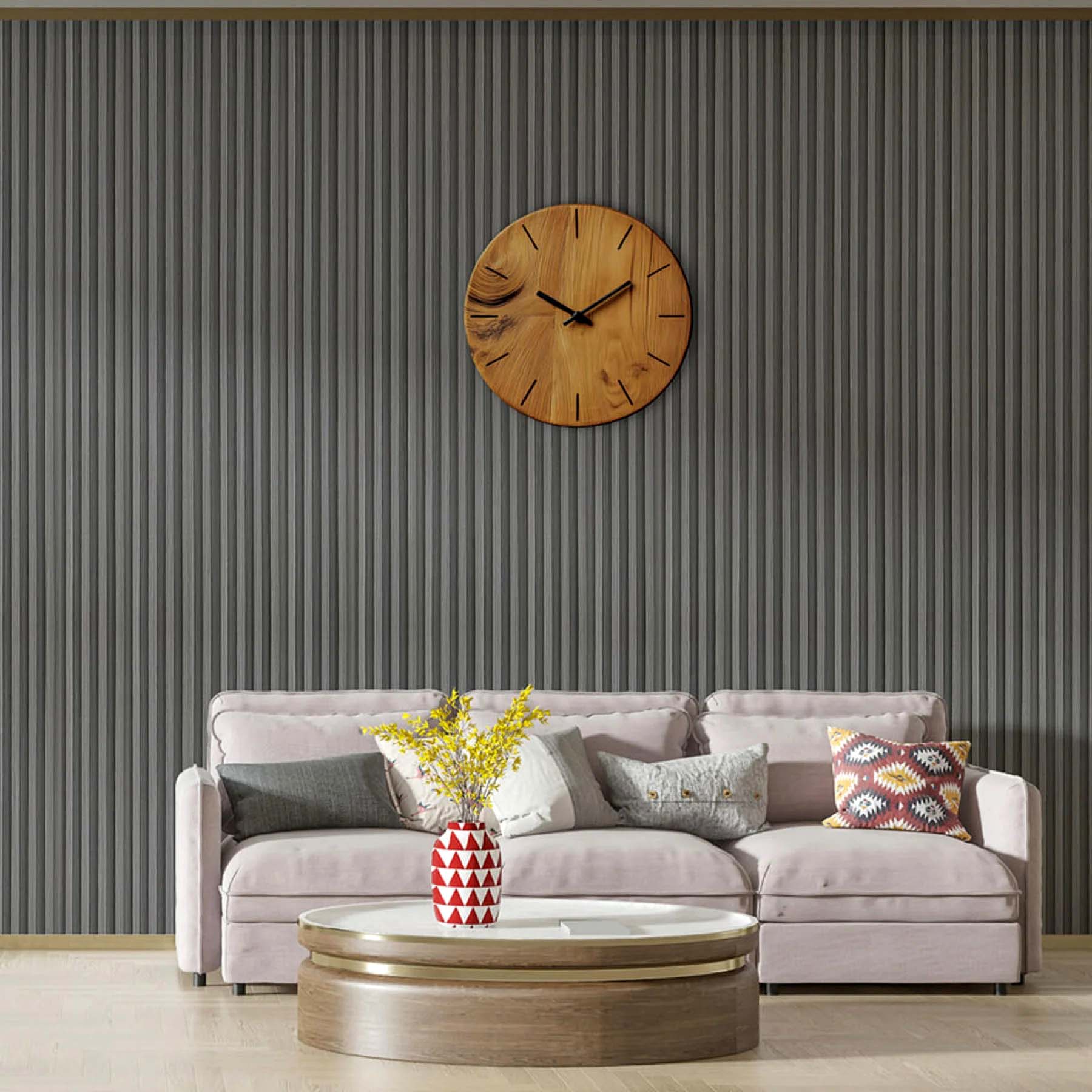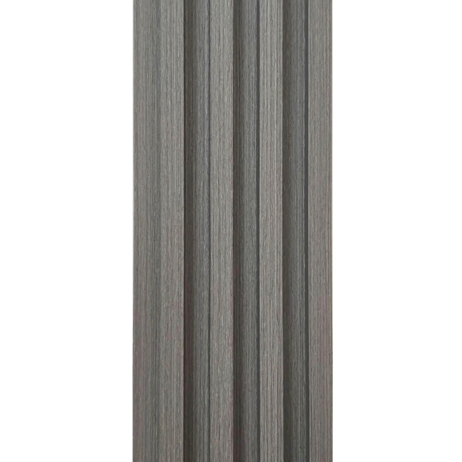 Декоративні рейки WPC не бояться вологи та сонячних променів, тому сіра структура олов’яних відтінків довго залишатиметься насиченою. Монтаж на клей дозволяє швидко оновити інтер’єр власноруч, не залучаючи професійних майстрів.