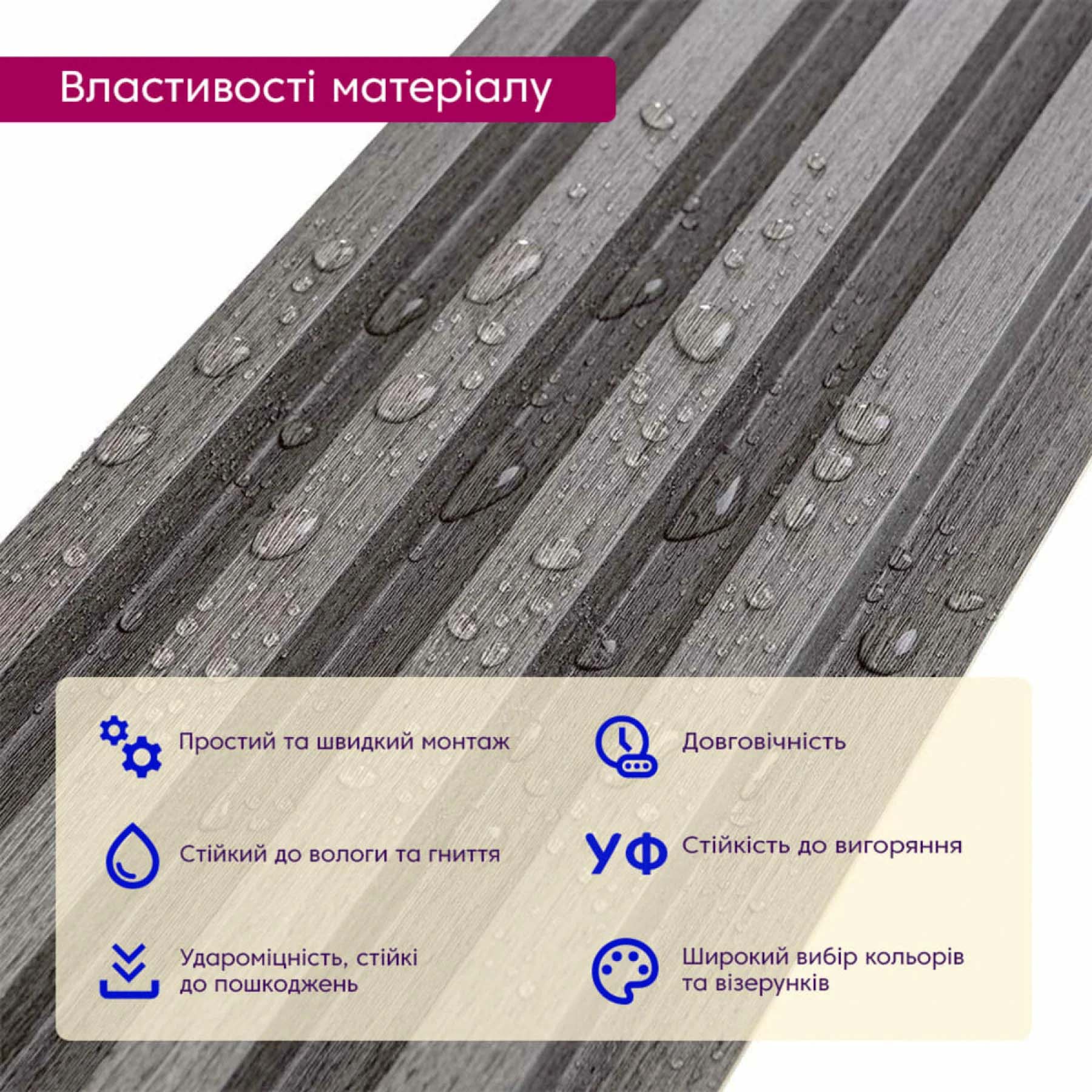 - УФ-стійкість: Колір і структура залишаються насиченими навіть під прямим сонцем.