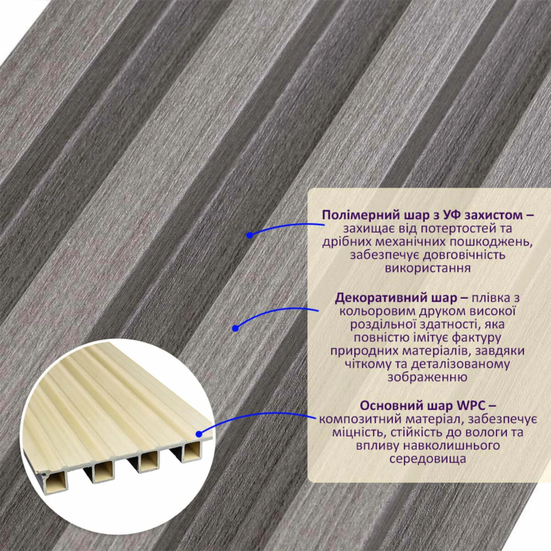 Рейка WPC стінова Сталева сіра SW-00001528 – стильний та практичний декоративний матеріал для ремонту квартири чи офісу допоможе створити вишуканий інтер’єр або оновити старі стіни.