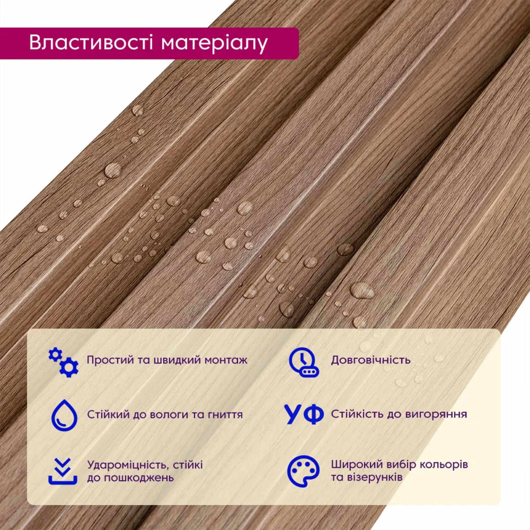 Фактура: рельєфна поверхня реалістично імітує дерев'яні рейки з виразною лінійною текстурою та м'якими прожилками. Вертикальні борозенки додають динаміки та глибини, створюючи ефект натуральної деревини зі стриманим характером.