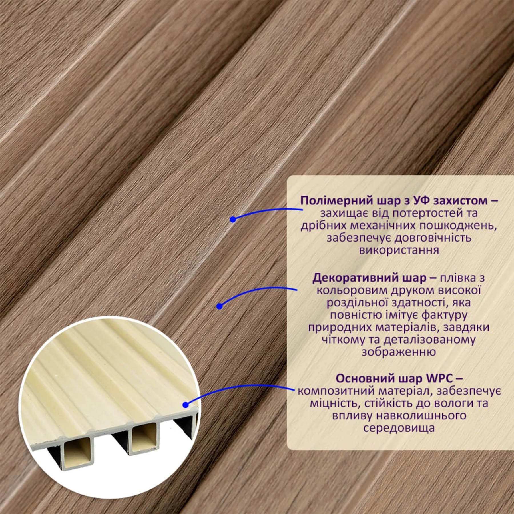 Рейки виготовлені зі суміші деревних волокон та полімерів. Вони зберігають візуальну теплоту дерева, стійкі до розтріскування, викривлення та вологи. Служать роками без складного догляду.