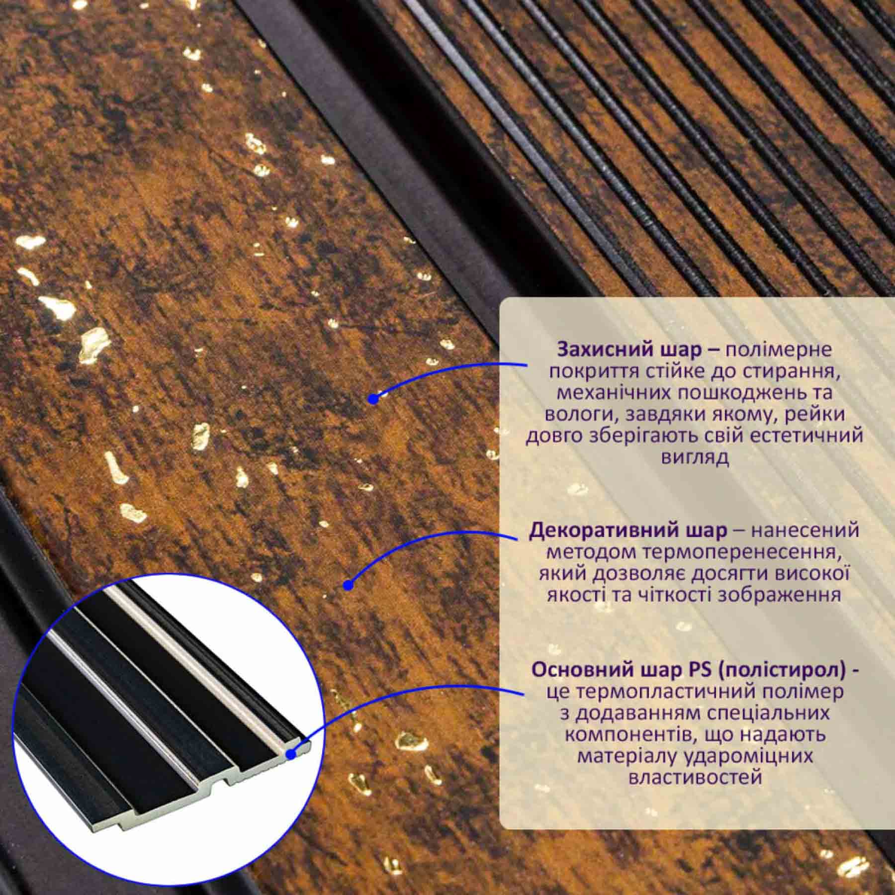 Декоративна рейка для стін PS 2900x120x12мм Мідна із золотими вкрапленнями - вишуканий довговічний оздоблювальний матеріал з практичними властивостями допоможе реалізувати швидкий ремонт в квартирі.
