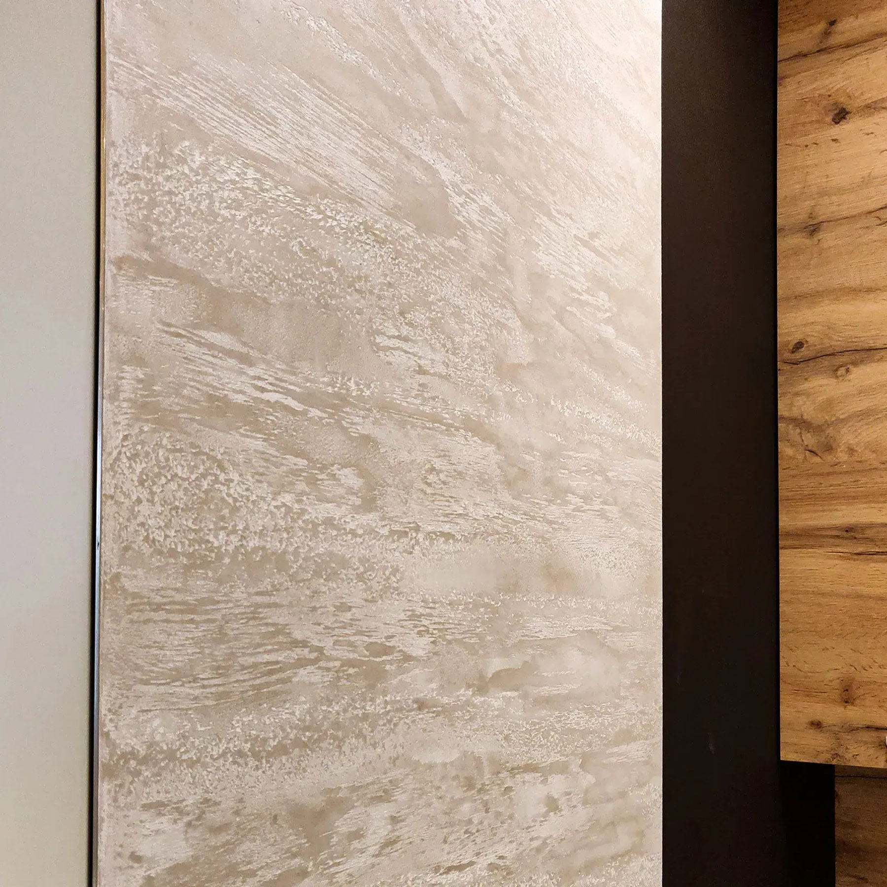 Декоративна штукатурка з елегантним оксамитовим переливом під мокрий шовк утворюється завдяки металевим пігментам у складі суміші. Декоративна суміш у вигляді фарби створює напрочуд цікавий ефект на заломленні променів світла: шовкова текстура змінюється під різним кутом огляду.