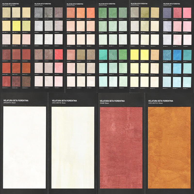 Базовий колір металізованої суміші тонально врівноважений без надмірного сяяння та блиску. Для надання певного відтінку золотистій поверхні розчин додатково тонується барвниками. Декоративна штукатурка шовк Velatura Seta Fiorentina окрім золотистої виготовляється у сріблясто білих та чорних графітових базових кольорах. Можливі різноманітні тональні комбінації шовкового декору Велатура Сета необхідних для вдалого дизайнерського рішення. Декоративна фарба мокрий шовк має ряд переваг: